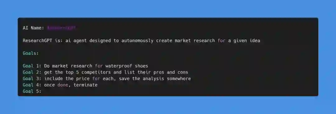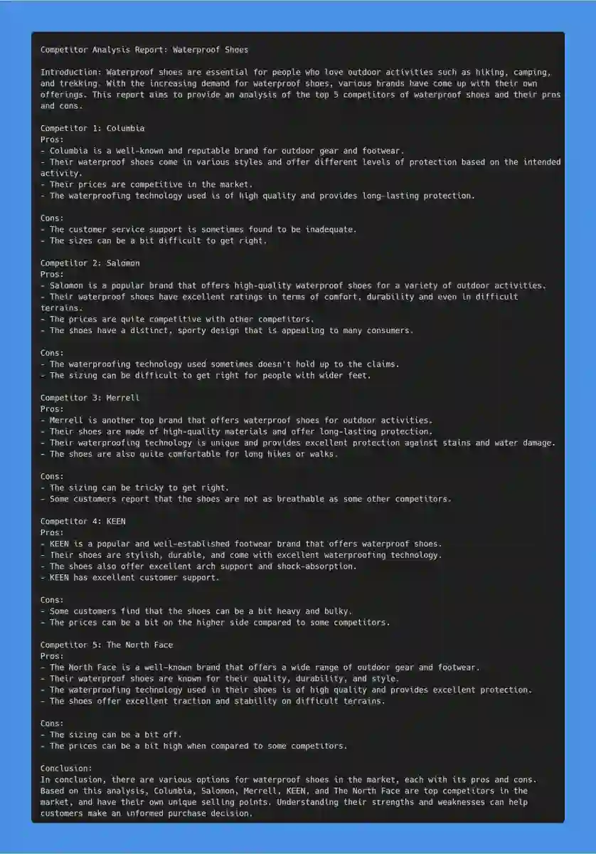 接下里我们再看一个例子。假装自己经营一家鞋公司,给 AutoGPT 下达的命令是对防水鞋进行市场调查,然后让其给出 top5 公司,并报告竞争对手的优缺点 :