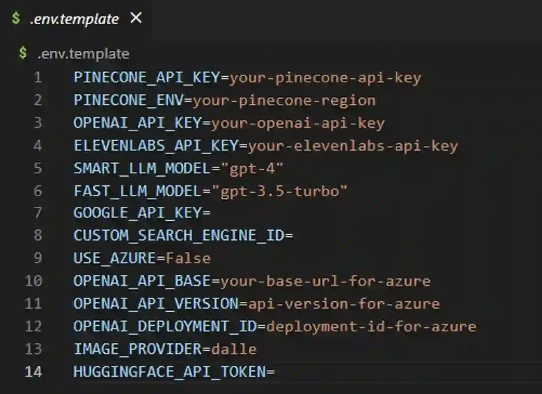 在 Auto-GPT 文件夹中,找到.env.template 文件并插入 OpenAI API 密钥。接着复制该文件并重命名为.env。