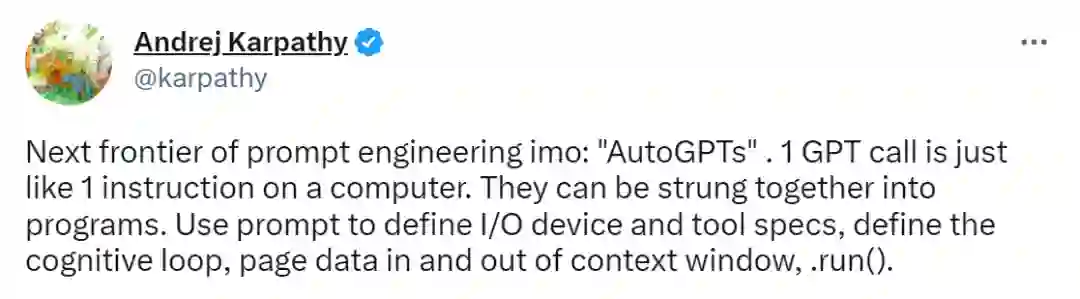 OpenAI 的 Andrej Karpathy 都大力宣传,认为 AutoGPT 是 prompt 工程的下一个前沿。