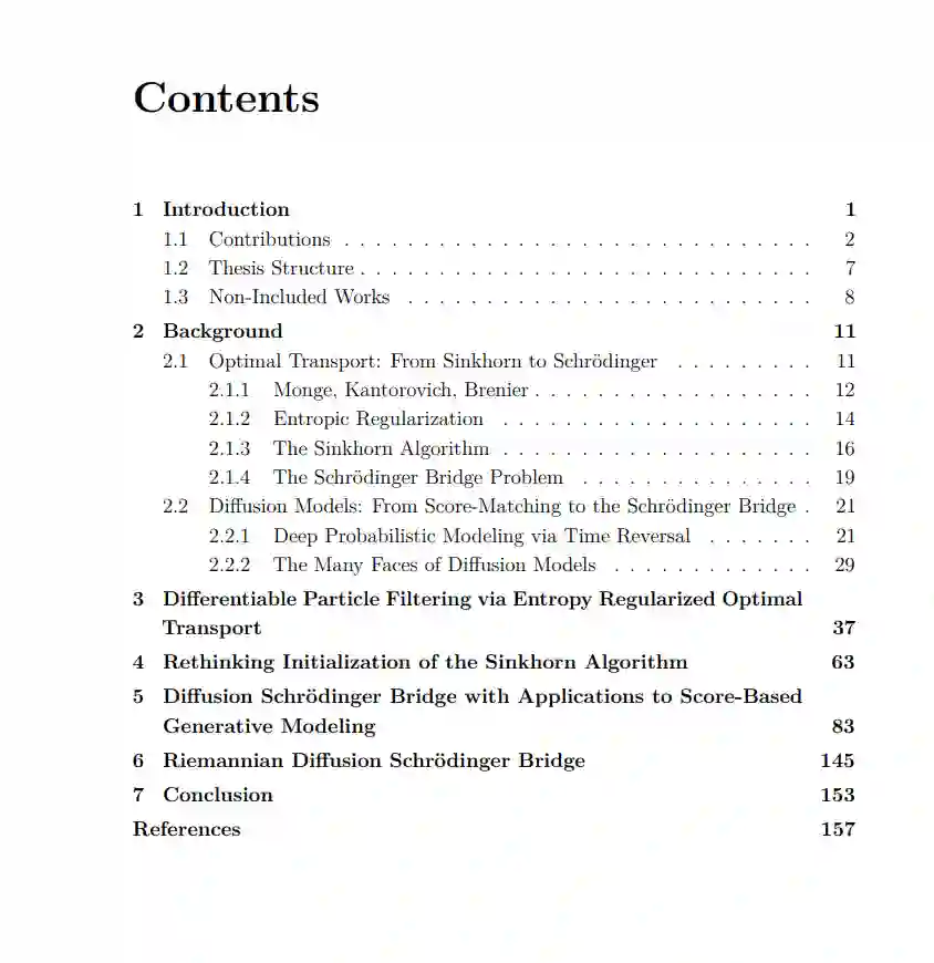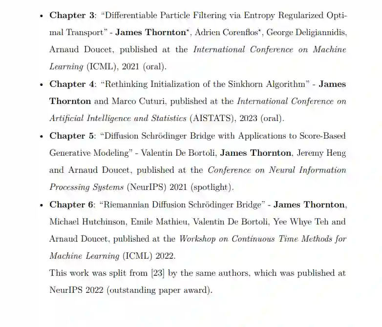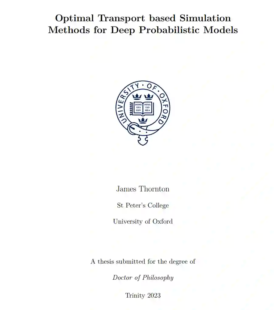 深度概率模型在高维、多模态数据合成和密度估计任务中已成为最新的技术前沿。通过将抽象的概率公式与神经网络的表达能力和可扩展性相结合,深度概率模型已成为机器学习工具箱中的基本组成部分。然而,这些模型仍然存在一些局限性。例如,深度概率模型通常局限于基于梯度的训练,因此难以结合非可微操作;它们的训练和采样成本较高;并且深度概率模型往往没有利用先验的几何和特定问题的结构知识。 本论文由四部分研究工作组成,通过基于最优传输的仿真方法推动深度概率模型领域的发展。首先,使用Sinkhorn算法的正则化最优传输,我们提供了一个理论上有依据且可微的粒子滤波中重新采样的近似方法。这使得人们能够通过端到端可微粒子滤波对状态空间模型(一类序列概率模型)进行基于梯度的训练。接下来,我们探讨了Sinkhorn算法的初始化策略以解决速度问题。我们展示了精心的初始化可以显著加速Sinkhorn算法。这在可微排序、变分自编码器潜在空间中的聚类以及粒子滤波中都有应用。 剩下的两项工作通过薛定谔桥对基于扩散的生成模型领域作出了贡献。首先,我们将扩散模型与薛定谔桥联系起来,称之为扩散薛定谔桥。这一方法论实现了加速采样、数据到数据的仿真以及一种计算高维连续状态空间问题的正则化最优传输的新方法。最后,我们将扩散薛定谔桥扩展到黎曼流形设置。这使得人们能够结合先验的几何知识,从而实现对黎曼流形值数据的扩散模型的更高效的训练和推理。这在气候和地球科学中有应用。 观察到的现象通常具有高维度、分布上多模态,并且来自于尚未完全理解的随机复杂系统。科学家的职责是更好地理解我们周围物理和社会世界中的这些观察现象。对统计机器学习研究人员特别感兴趣的是开发数据驱动的模型来模拟和预测感兴趣的随机量及其相互作用。此类数据驱动的机器学习方法通常包括利用大型数据集和富有表现力的模型参数化来弥合领域知识与经验证据之间的差距。 随着技术的进步,我们现在能够捕获、存储和访问大量且不断增加的数据。结合现代计算资源,广大数据可用于从业者训练大型且灵活的神经网络参数化模型。富有表现力的神经网络与理论上有依据的统计方法之间的协同作用,提供了一种原则性的、可扩展的方式来准确表示感兴趣的随机量之间复杂关系。深度概率模型正位于此交汇点,并已成功应用于多个领域,包括:视觉和语言的经典机器学习任务;时间序列、预测或密度估计的统计推断问题;以及自然科学应用。尽管进展迅速,但仍有许多未解决的挑战。深度概率模型在训练和部署方面都资源昂贵。如何高效地训练和模拟概率模型尚不明确,尤其是对于迭代扩散模型。也不总是清楚如何将现有的特定问题知识或结构融入深度概率模型中。从直观和实验上来看,结合现有知识可以开发出更有效的损失目标和更高效的模型,从而减少学习高性能模型所需的数据量和参数量。最终,结合领域知识可以减少神经网络需要通过从数据中学习来弥合的差距。在将涉及非可微操作(如排序、聚类或重采样)的理论上有依据的统计方法与通常限于基于梯度训练的深度网络的表现力相结合方面,也存在许多挑战。 本论文通过引入基于最优传输和仿真方法的新方法,对深度概率模型的发展作出了贡献。 贡献