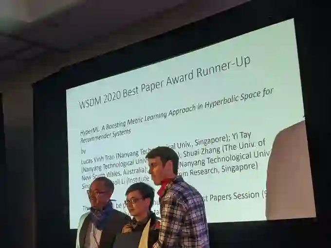 HyperML: A Boosting Metric Learning Approach in Hyperbolic Space for Recommender Systems Lucas Vinh Tran, Yi Tay (Nanyang Technological University, Singapore); Shuai Zhang (The University of New South Wales, Australia); Gao Cong (Nanyang Technological University, Singapore); Xiaoli Li (Institute for Infocomm Research, Singapore).