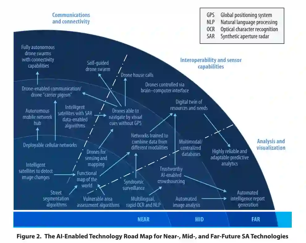 灾难响应期间的态势感知是至关重要的,因为它使响应团体能够在灾难时间敏感的急性阶段迅速和有效地帮助那些有迫切需要的人。新技术可以极大地提高响应行动的效率:用卫星图像快速绘制飓风的破坏性路径,用社交媒体追踪确定需求增加的社区,用计算机建模预测野火的路线以通知疏散。美国政府已经优先在整个联邦机构实施人工智能(AI)系统,包括那些可能有助于灾难响应的技术。在这份报告中,我们提供了一个技术路线图,用于向响应社区提供近期和更远期的人工智能技术,这些技术可以在灾害期间帮助提高态势感知。通过探索当前和历史上的技术趋势、成功和困难,我们设想了这种新技术可能给灾害响应带来的好处和脆弱性。考虑到与灾害和人工智能技术相关的复杂性,有必要采取综合的发展方法,以确保新技术既是科学驱动的,又是操作上可行的。