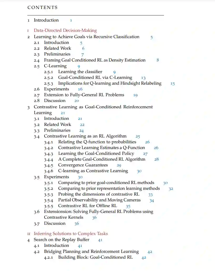 这篇论文基于初步论文提案中提出的工作在两个主要方向上进行了深入。首先,我们探讨了递归分类的几何解释(第2章),在表示学习和强化学习之间建立了紧密的联系(第3章)。这种联系使我们能够将递归分类扩展到通过有限数量的奖励标记状态后设定的任务,并使我们能够将这些方法应用到基于真实世界图像的机器人操作任务上。其次,我们扩展了RL的潜在变量观点(第4章和第5章)以在学习的表示上执行推断(第5.6节)。这种扩展使我们的方法能够扩展到更高维度的任务,并提供了大量的计算加速。