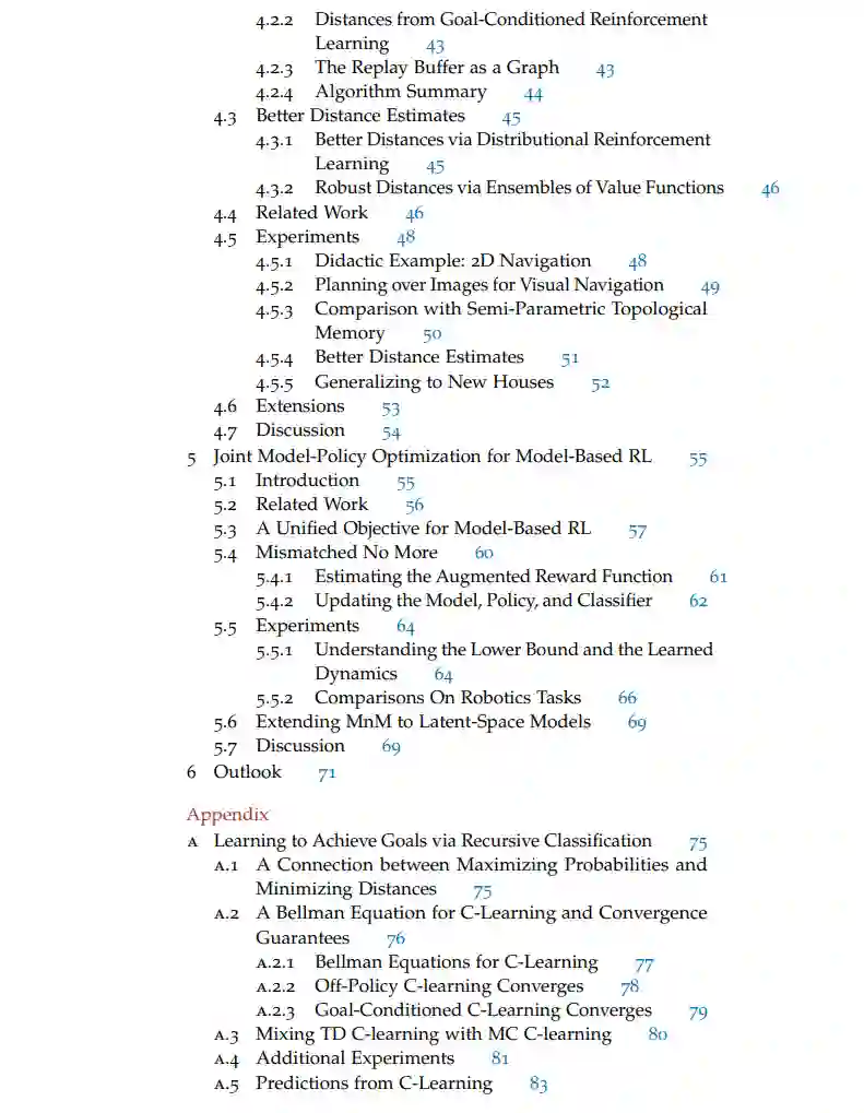 我们首先讨论以目标为条件的设置,这种推断观点导致了一个简单且理论上有正当理由的方法,将面向目标的RL集成到传统的规划流程中(第4章)。RL被用来估计距离并学习一个局部策略,而观察(如,图像)上的图搜索确定了通往目标的高级路径。这种方法显著优于标准的目标条件RL算法。接着,我们考虑一种不同的方式来构造任务解决方案:作为一个学习过的动态模型和策略的组合(第5章)。结果是一个基于模型的RL算法,其中模型和策略使用相同的目标联合优化,这是预期回报的下界。