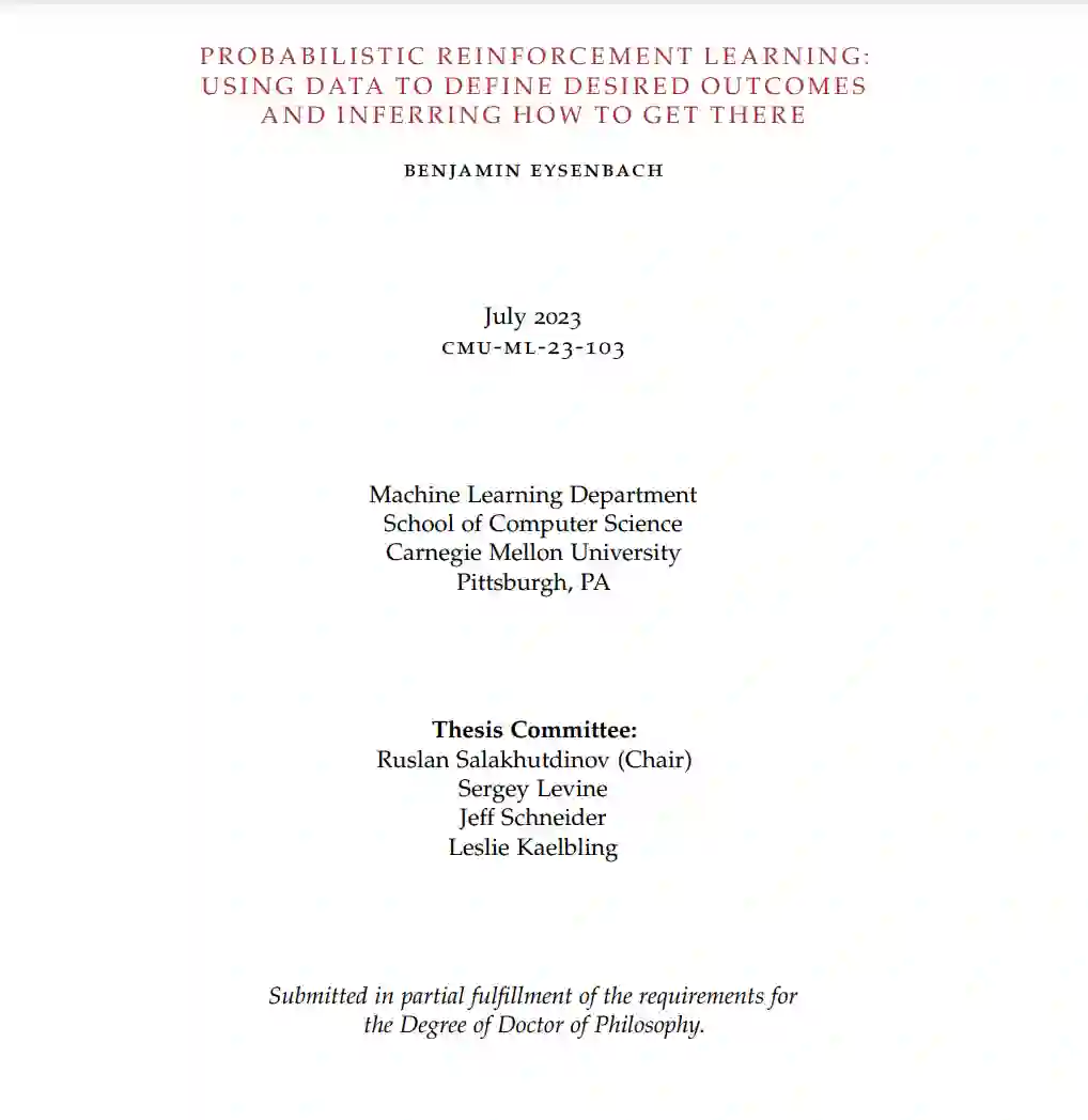 这篇论文研究了通过试错学习教导自主智能体完成任务的算法。通常,这个问题被描述为一个强化学习(RL)问题,其中智能体试图最大化用户提供的奖励函数。这里研究的算法采取了不同的方法,大部分避免使用奖励函数,而是直接从数据中学习实现期望的结果。这种方法允许用户使用来自监督学习和非监督学习的算法工具,同时也为非专家用户提供了一个教导智能体新任务的界面。这些方法的设计中的主要挑战是预测期望结果的概率,尤其是当这些结果在未来的数百步中才发生,特别是在使用离策略数据时。为此,这篇论文的第一部分基于递归分类开发了一种算法,该算法通过时间差分更新估计未来状态的概率(第2章)。这种方法直接适用于具有连续状态和动作的环境,不需要任何手工制作的距离度量,并导致了一个比之前的方法更高效的面向目标的RL算法。然后,我们将这个想法推广到可以通过多种方式解决的任务,允许更灵活的任务规范,并提供更广泛的泛化能力。