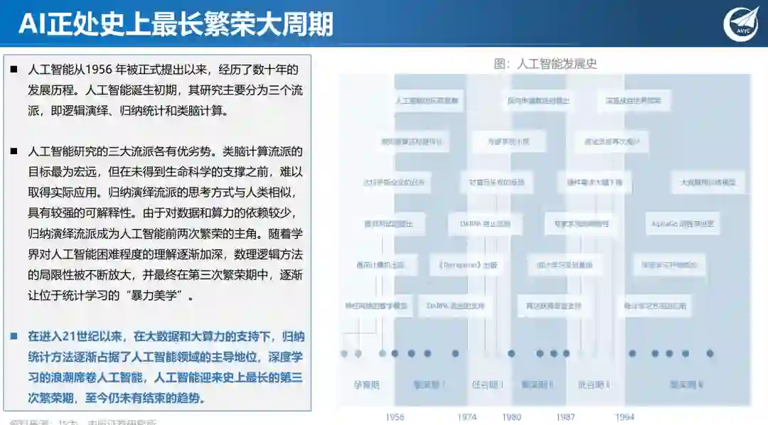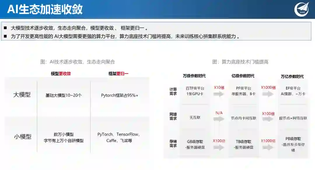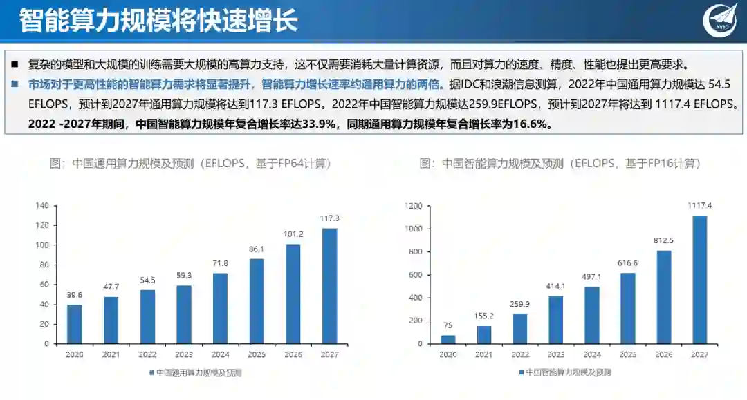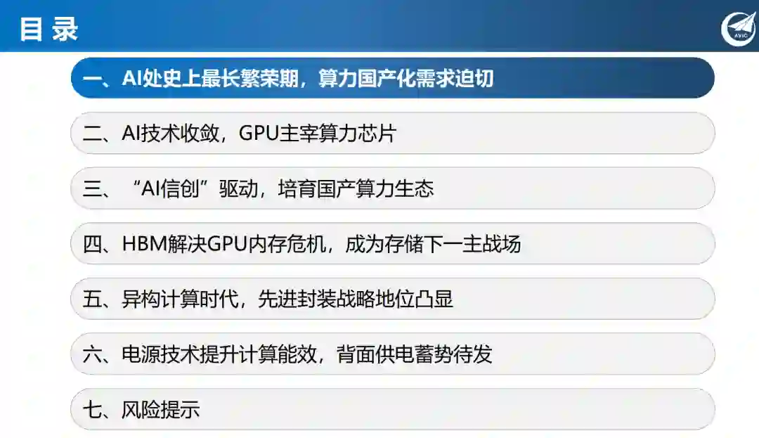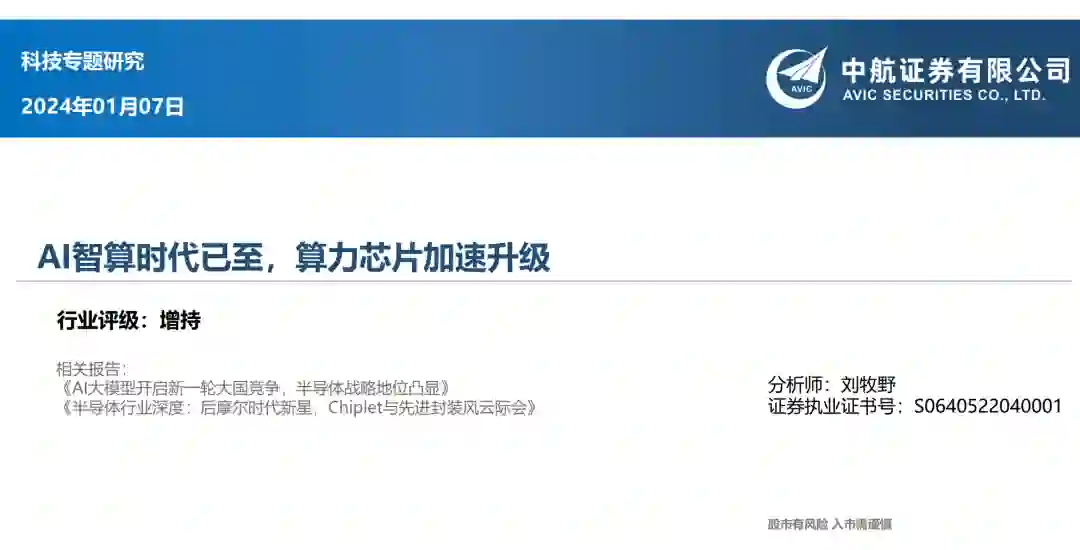 AI正处史上最长繁荣大周期,生态加速收敛:在进入21世纪以来,在大数据和大算力的支持下,归纳统计方法逐渐占据了人工智能领域的主导地位,深度学习的浪潮席卷人工智能,人工智能迎来史上最长的第三次繁荣期。智算中心的发展基于最新人工智能理论和领先的人工智能计算架构,当前算法模型的发展趋势以AI大模型为代表,算力技术与算法模型是其中的核心关键,算力技术以AI芯片、AI服务器、AI集群为载体。 GPU主宰算力芯片,AI信创驱动国产算力发展:得益于硬件支持与软件编程、设计方面的优势,CPU+GPU成为了目前应用最广泛的平台。AI分布式计算的市场主要由算力芯片(55-75%)、内存(10-20%)和互联设备(10-20%)三部分组成。美国已限制对华销售最先进、使用最广泛的AI训练GPU—英伟达A100以及H100,国产算力芯片距离英伟达最新产品存在较大差距,但对信息颗粒度要求较低的推理运算能实现部分替代。 提升算力内存带宽,HBM供不应求:由于ChatGPT的爆火,GPU需求明显,英伟达也加大对三星和SK海力士HBM3的订单。2023年10月,SK海力士表示,已经在2023年出售了明年HBM3和HBM3E的所有产量。据Omdia预测,到2025年,HBM市场的总收入将达到25亿美元。 集成算力与存力,先进封装产能紧缺:CoWoS封装技术是目前集成HBM与CPU/GPU处理器的主流方案。台积电主导全球CoWoS封装市场。据IDC预测,全球CoWoS供需缺口约20%,2024年台积电的CoWos封装产能将较2023年提升一倍,2.5D/3D先进封装市场规模在2023-2028年将以22%的CAGR高速增长。 AI算力对高效电源提出新需求,背面供电技术蓄势待发:越来越高度化的集成会造成针对加速芯片的电源解决方案越来越复杂,方案需要不同电压、不同路的多路输入,这种情况下电压轨会越来越多。台积电、三星、英特尔等芯片大厂都在积极布局背面供电网络技术,为日益复杂的芯片提供高效供电方案,其中英特尔较为领先。