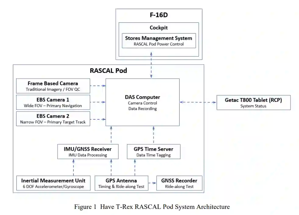 测试中的系统(SUT)包括基于事件的传感器(EBS)和惯性测量单元(IMU),安装在 F-16D 上的可重构机载传感器、通信和激光(RASCAL)吊舱中,以提高目视测距性能。EBS 通过硬件实现强度变化检测。这种操作理念提高了时间分辨率和动态范围,而且功耗低,有利于快速运动和低/变化的环境照明条件。SUT 的导航算法通过卡尔曼滤波器处理 EBS 图像来识别特征运动,并辅以 IMU 数据来预测飞机的位置、速度和姿态。SUT 算法尚未用于飞行中的导航估计;所有导航估计都是在飞行后进行的。