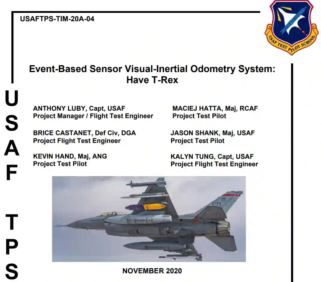 本报告介绍了用于基于事件的视觉惯性里程测量的机载事件传感器的性能和结果,项目名称为 Have T-Rex。测试由俄亥俄州赖特-帕特森空军基地空军技术研究所自主导航技术中心(AFIT/ANT)要求进行。开发测试的牵头机构是加利福尼亚州爱德华兹空军基地的空军测试中心。执行测试机构是第 412 测试联队。测试由美国空军试飞员学校 20A 班在加利福尼亚州爱德华兹空军基地进行,是学生测试管理项目的一部分。测试于 2020 年 9 月 8 日至 2020 年 9 月 21 日进行,包括驾驶编号为 87-0377 的 F-16 进行 21.4 个小时(13 架次)的飞行测试,以及驾驶 T-38C 作为空中目标进行 2.2 个小时(2 架次)的飞行测试支持。