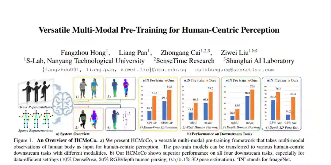以人为中心的感知在视觉和图形学中起着至关重要的作用。但是他们的数据注释非常昂贵。因此,希望有一个通用的预训练模型,作为数据高效的下游任务转移的基础。为此,我们提出了以人为中心的多模态对比学习框架HCMoCo,该框架利用人类数据的多模态特性(如RGB、深度、2D关键点)来进行有效的表示学习。该目标面临两个主要挑战: 多模态数据的密集预训练,稀疏人类先验的有效利用。**为了解决这一问题,我们设计了一种新型的密集样本内对比学习和稀疏结构感知对比学习目标,通过层次化学习具有连续和有序特征分布和结构感知语义一致性的模态不变潜空间。**HCMoCo通过组合异构数据集为不同的模态提供预训练,这允许有效地使用现有的特定于任务的人类数据。在四个不同模式的下游任务上的大量实验证明了HCMoCo的有效性,特别是在数据效率设置下(DensePose Estimation和Human Parsing提高了7.16%和12%)。此外,通过探索跨模态监督和缺失模态推理,我们证明了HCMoCo的多功能性,验证了它在跨模态联想和推理方面的强大能力。