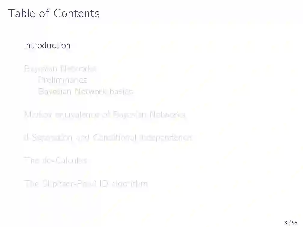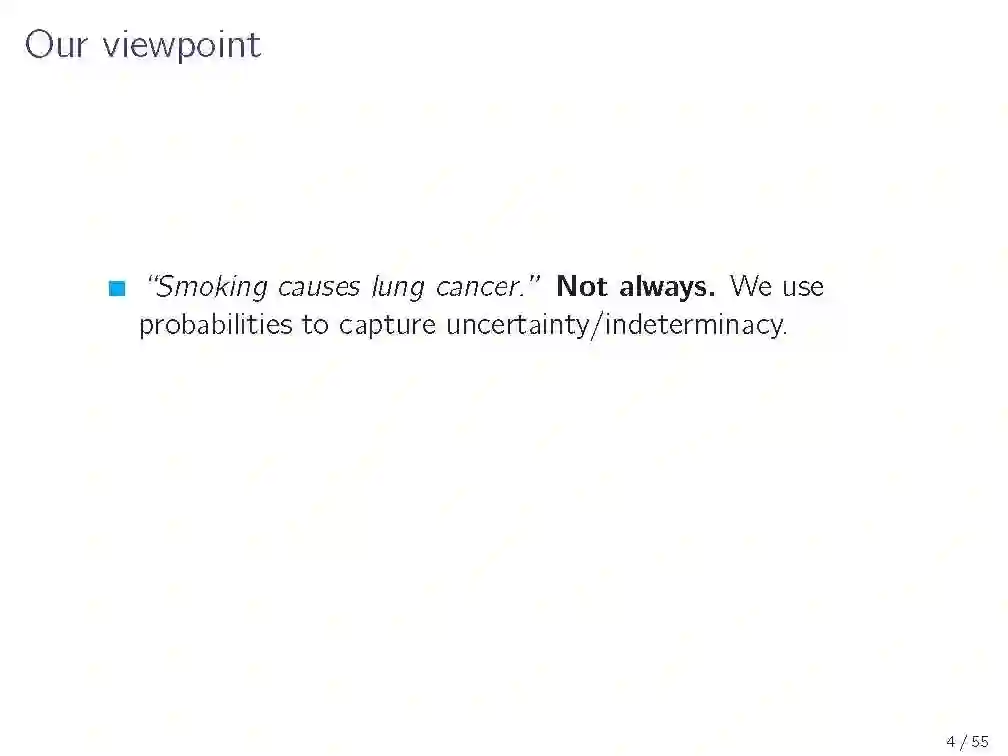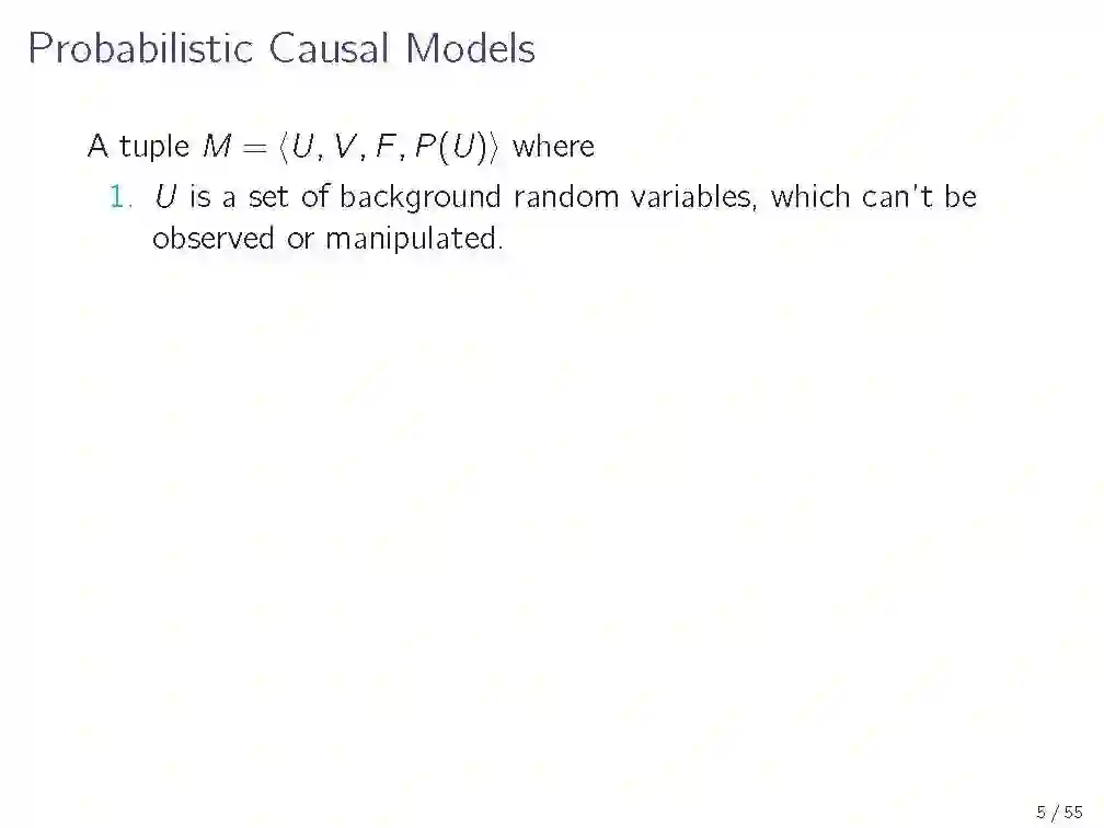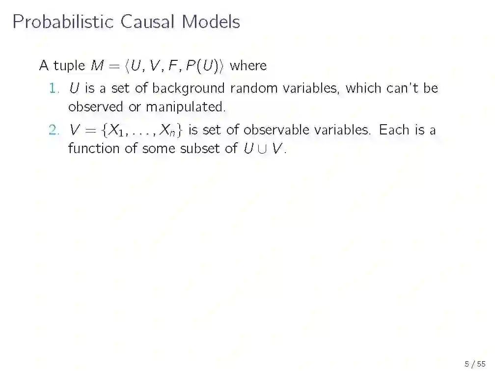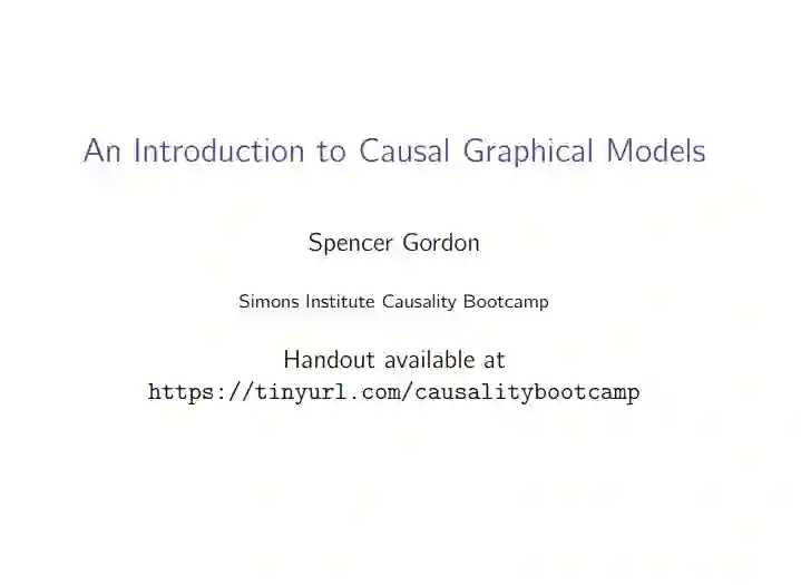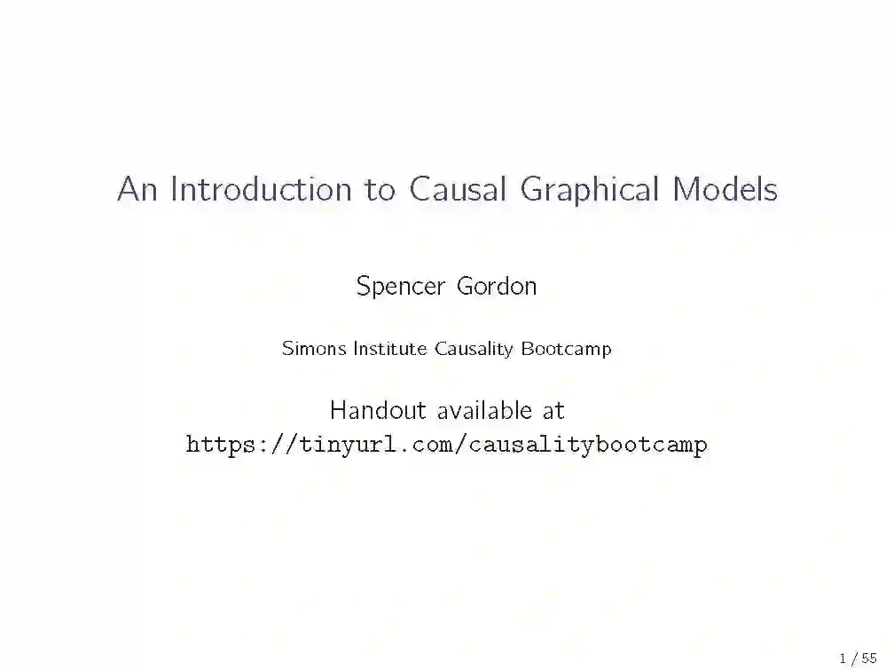本讲座将介绍贝叶斯网络及其因果解释,如因果图模型、d-分离、微积分和Shpitser-Pearl ID算法。我们将从介绍贝叶斯网络、因果图模型和干预开始。然后,我们将展示两个具有相同骨架和v结构的贝叶斯网络,它们代表了相同的条件独立假设,并证明存在于任何贝叶斯网络中的d分离,会使所有条件独立假设在根据该网络进行因数分解的任何分布中都不成立。然后我们转向因果模型并引入微积分。我们展示了每一个演算规则的合理性。最后,我们描述了半马尔可夫模型中因果效应识别的shpitsere - pearl算法,并在时间允许的情况下,证明了该ID算法对因果效应识别的完备性;也就是说,当且仅当ID算法成功终止时,因果关系是可识别的。