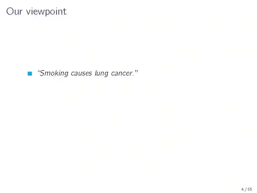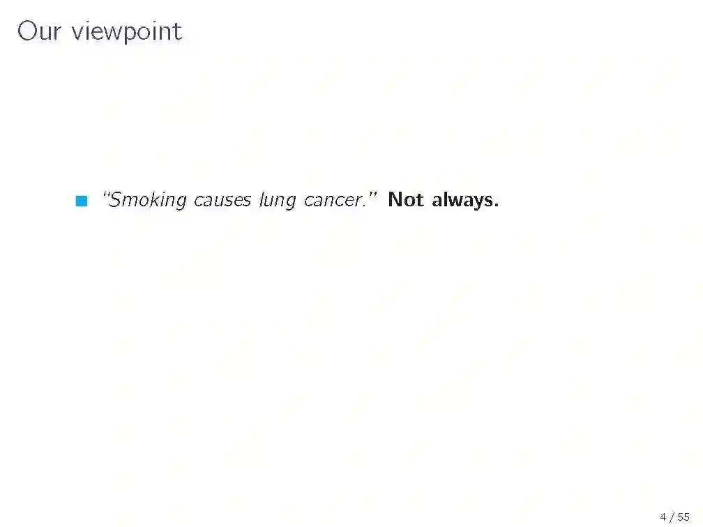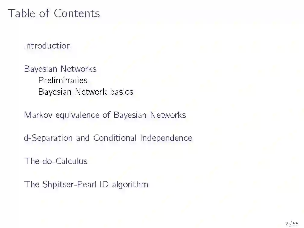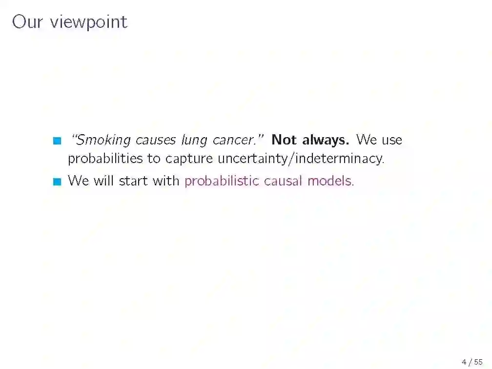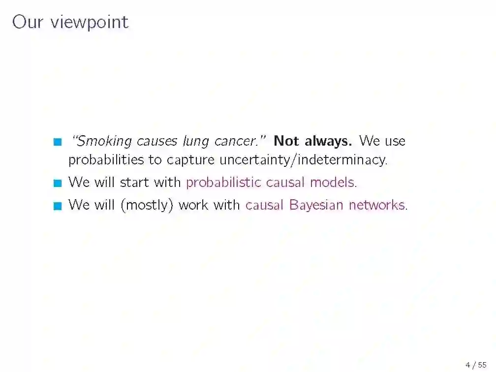 本讲座将介绍贝叶斯网络及其因果解释,如因果图模型、d-分离、微积分和Shpitser-Pearl ID算法。我们将从介绍贝叶斯网络、因果图模型和干预开始。然后,我们将展示两个具有相同骨架和v结构的贝叶斯网络,它们代表了相同的条件独立假设,并证明存在于任何贝叶斯网络中的d分离,会使所有条件独立假设在根据该网络进行因数分解的任何分布中都不成立。然后我们转向因果模型并引入微积分。我们展示了每一个演算规则的合理性。最后,我们描述了半马尔可夫模型中因果效应识别的shpitsere - pearl算法,并在时间允许的情况下,证明了该ID算法对因果效应识别的完备性;也就是说,当且仅当ID算法成功终止时,因果关系是可识别的。