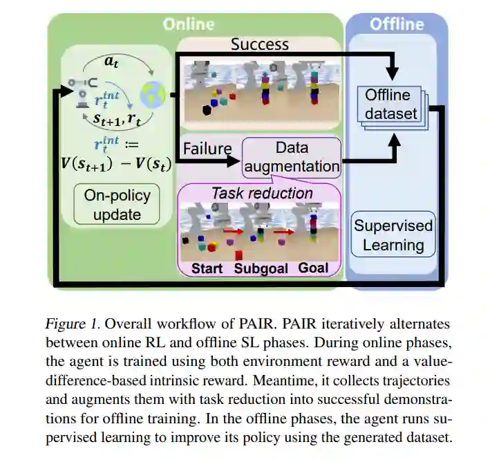 利用监督学习(SL)的力量开发更有效的强化学习(RL)方法已经成为最近的一种趋势。为了解决稀疏奖励目标条件问题**,我们提出了一种新的分阶段方法,即在线反馈学习和离线反馈学习交替进行**。在在线阶段,我们执行RL训练并收集上线数据,而在离线阶段,我们对数据集中成功的轨迹执行SL。为了进一步提高样本效率,我们在在线阶段采用了额外的技术,包括减少任务生成更可行的轨迹和基于价值差异的内在奖励来缓解稀疏奖励问题。我们称这种整体算法为PhAsic自拟约简(PAIR)。在稀疏奖励目标条件机器人控制问题(包括具有挑战性的堆叠任务)上,PAIR大大优于非相位RL和相位SL基线。PAIR是第一个RL方法,它学习了从零开始堆叠6个立方体,只有0/1的成功奖励。