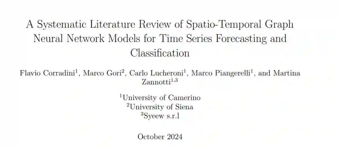 近年来,图神经网络(GNNs)作为处理图结构数据的强大人工神经网络模型类别,受到了广泛关注。GNNs 尤其适用于数据自然表示为图结构的广泛实践和工程应用,如交通网络、图像分析和自然语言处理等应用。这一方法背后的直观概念是,图中的节点可以对应于对象或概念,而边则表示它们之间的相互关系。GNN 模型能够一次性处理这些量的数据。GNNs 可用于三类问题:图级问题、边级问题和节点级问题。在图级问题中,目标是基于图的整体结构预测其属性,而不是单独的节点或边。例如,一个样本中的分子可以表示为一个图,其整体结构可以提供关于该分子的全球属性信息。在边级问题中,目标是预测节点对之间边的存在或缺失。例如,该任务可用于推荐系统,根据过去的交互预测用户和项目之间的潜在连接。在节点级问题中,目标是预测图中每个节点的身份或角色,以解决分类或回归任务。值得注意的是,回归任务可以是“自回归”,即它们可以包含时间。 本综述进一步考察了 GNN 在时间序列相关任务中的具体应用,特别关注时间序列分类和预测。使用 GNNs 进行时间序列问题的核心思想是,GNNs 能够同时捕捉复杂的关系,包括变量间关系(多变量序列内不同变量之间的连接)和时间间关系(不同时间点之间的依赖性)。这构成了一个时空 GNN 方法,其中空间维度与多变量框架相关,时间维度与数据的时间特性相关。即,时空 GNNs 是一种旨在同时处理空间和时间维度数据的 GNN 模型。在这种情况下,时空图中的每个节点或边的数据可以随时间演变,挑战在于建模这些随时间动态变化的相互作用。 尽管这一领域潜力巨大,但据我们所知,尚缺乏关于时间序列应用的时空 GNN 模型的系统文献综述(SLR)。现有的综述大多不是系统文献综述,要么不够新,要么只关注有限的应用领域。个别近期综述集中在算法特征 [9], [132], [200], [18]、GNN 特性 [199]、特定领域 [80] 和分布式训练 [125], [162]。唯一一篇关于时空 GNNs 的 SLR 是 Zeghina 等人 [223] 最近发布的,但由于搜索查询限制,它仅涵盖了 52 篇文献。 本 SLR 的意图是提供关于时空 GNN 在不同领域的时间序列分类和预测应用的广泛而全面的概览。本 SLR 还旨在评估时空 GNN 模型当前流行的原因是否确实源于其有效性,并评估其在不同领域中的效率和准确性。此外,它收集了结果和基准,以便通过综合 GNN 应用的现有文献帮助研究人员。据我们所知,这是首个提供全面表格并汇总各种模型和基准在高度分散文献中结果的综述。希望这些整理和提炼的知识能够成为研究人员的宝贵资源和参考。 在本综述中,我们将提出两组问题。第一组问题旨在提供该领域出版物的总体概览,而第二组问题则关注提出的 GNN 模型的具体方面。 总体概览问题(GQs)如下: