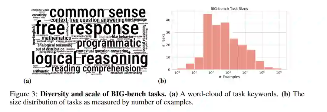 考虑到预测大型语言模型的潜在变革性影响的重要性,以及当前基准测试的局限性,我们引入了一个大规模、极其困难和多样化的基准测试。然后我们在这个基准上测量模型的性能。为了衡量模型性能是否与人的性能有很大的区别,我们提供了一个人工评估基准和专家对这组不同任务的人工评估。此外,模型是跨尺度测量的,以便于简单的尺度外推,在这个尺度上,它们可能与人类评估者没有区别。为了向艾伦·图灵的模仿游戏(图灵,1950)致敬,因为我们的目标是提取模型行为的信息,而不是从模型是否与人类不同的二元判断中获得的信息,我们把这个基准称为超越模仿游戏基准,或BIG-bench。我们还介绍了精简版的BIG-bench(第2.2节),它包含24个任务,用于轻量级评估。该基准是在GitHub上公开开发的,贡献者通过GitHub拉请求的方式添加任务。通过对拉请求的讨论,对提议的任务进行同行评审。为了激励贡献,所有接受任务的作者都有机会成为这篇介绍BIG-bench的论文的共同作者。我们使用这个基准来分析密集和稀疏变压器模型,从谷歌和OpenAI,跨越6个数量级的模型规模。我们特别感兴趣的是预测语言模型未来的功能。因此,在我们的分析中,我们不关注任何单一模型的性能,而是关注性能如何随着模型规模的变化而变化。对于选择的任务,我们研究特定的模型能力如何随着规模的发展而发展。图1显示了在所有BIG-bench任务中超过5个数量级的模型的总体性能。