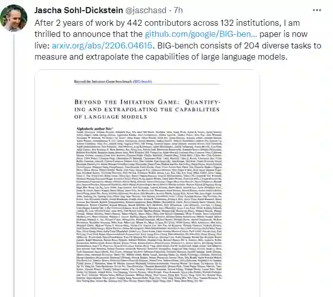 随着规模的扩大,语言模型既表现出定量的改进,又表现出新的定性能力。尽管它们具有潜在的变革性影响,但这些新能力的特征还不明确。为了指导未来的研究,为颠覆性的新模型能力做好准备,并改进社会有害影响,我们了解语言模型现在和近期的能力和局限性是至关重要的。为了解决这一挑战,我们引入了超越模仿游戏基准(BIG-bench)。BIG-bench目前包含204项任务,由来自132个机构的442位作者贡献。任务的主题是多样化的,从语言学、儿童发展、数学、常识推理、生物学、物理学、社会偏见、软件开发等等。BIG-bench专注于那些被认为超出当前语言模型能力的任务。我们评估了OpenAI的GPT模型、Google内部密集transformer架构以及BIG-bench上switch式的稀疏transformer 的行为,这些模型的大小涵盖了数百万到千亿的参数。此外,为了提供强有力的基准,一组人类专家评分人员执行了所有任务。研究结果包括: 模型性能和校准都随着规模的增加而提高,但绝对值较差(与评分者的性能相比); 跨模型类的性能非常相似,尽管这得益于稀疏性;可预测的逐步提高的任务通常涉及大量知识或记忆成分,而在临界尺度上表现出“突破性”行为的任务通常涉及多个步骤或成分,或脆性指标;在模棱两可的环境中,社会偏见通常会随着规模的增加而增加,但这可以通过提示来改善。
