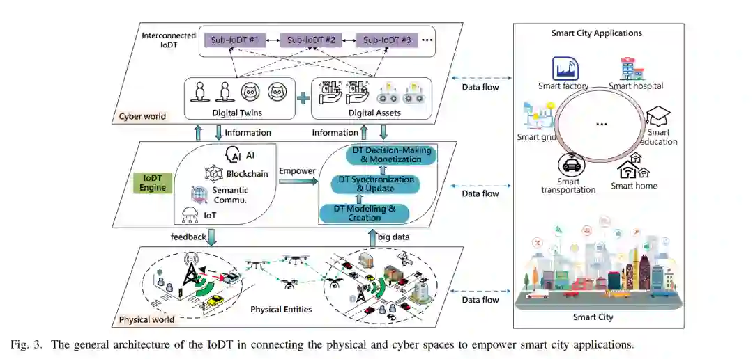 我们研究了IoDT的一般架构、通信模式(即孪生间和孪生内通信)、关键特征(即自主智能、分散结构、以信息为中心的路由和语义通信)、使能技术和现代原型。