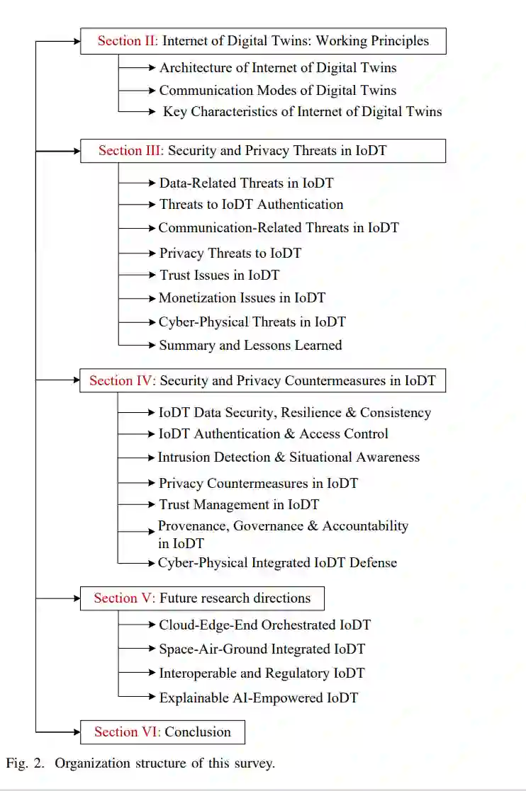 本文从系统架构、使能技术和安全/隐私问题等方面对IoDT进行了深入的综述。具体而言,我们首先探索了一种新颖的分布式IoDT架构,并讨论了其关键特性和通信模式。之后,我们调查了IoDT中安全与隐私威胁的分类,讨论了关键的研究挑战,并回顾了最先进的防御方法。最后,指出了与IoDT相关的新趋势和开放的研究方向。