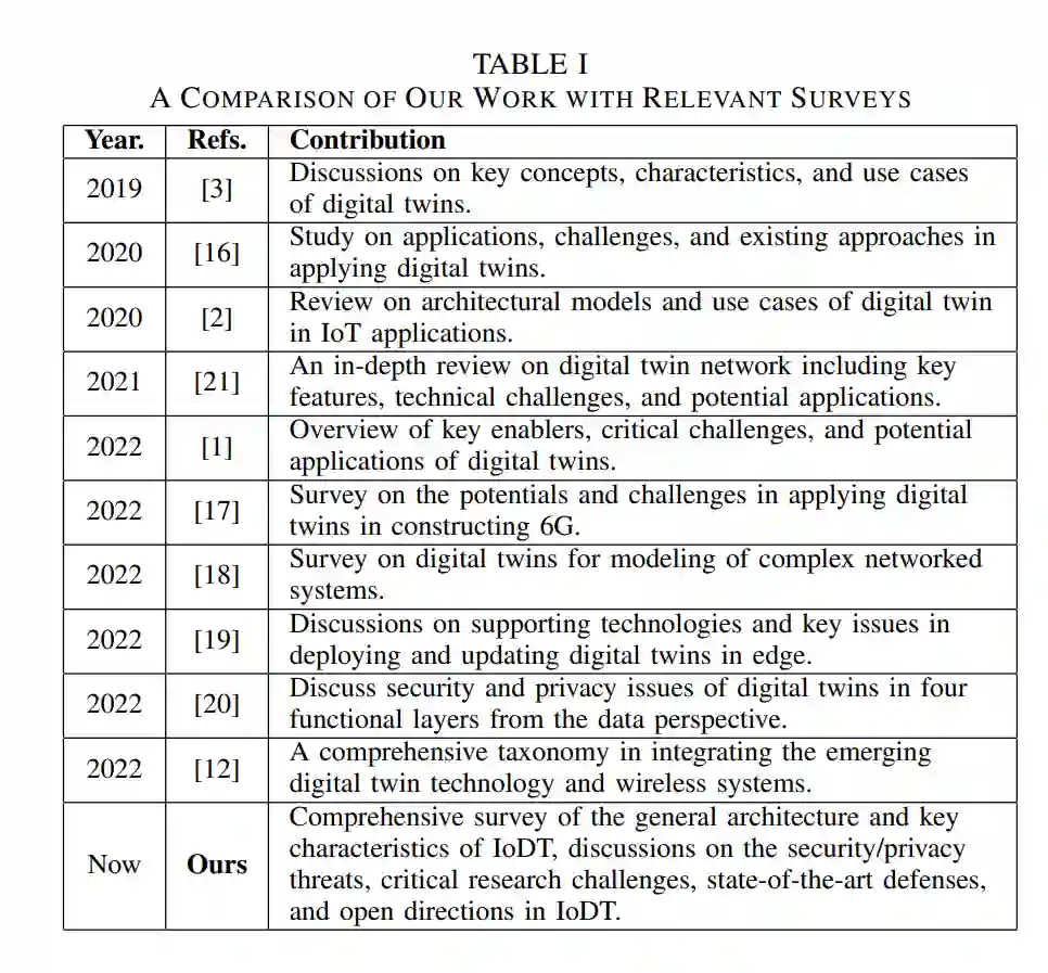 **各种各样的研究都集中在有前景的数字孪生上。到目前为止,人们已经从不同的角度对数字孪生进行了多次调研。**例如,Barricelli等人[3]讨论了数字孪生的关键概念、特征和用例。Fuller等人[16]研究了将数字孪生技术应用于制造业、医疗保健和智能城市的应用、挑战和现有方法。Mihai等人全面调研了数字孪生的关键推动因素、关键挑战和潜在应用。Minerva等人系统地回顾了架构模型以及物联网场景中数字孪生的用例。Kuruvatti等人[17]调查了应用数字孪生技术构建未来6G通信系统的潜力和挑战。Wen等人[18]回顾了现有的实现高效系统和复杂网络系统动力学建模的数字孪生的方法。Tang等[19]讨论了边缘环境下网络孪生部署和更新的支持技术和关键问题。Alcaraz et al.[20]从数据的角度研究了数字孪生的四个功能层,讨论了数字孪生在数据采集、数据同步、数据建模和数据可视化方面的安全和隐私问题。Wu等[21]提出了数字孪生网络,利用数字孪生技术来刺激和预测网络动态,以及演进和优化网络管理。此外,作者还对数字孪生网络进行了深入的回顾,包括主要特征、技术挑战和潜在的应用。Khan等人将新兴的数字孪生技术与无线系统相结合,提出了一种全面的分类法,包括twins for wireless和wireless for twins。与上述关于数字孪生的现有调查相比,本调查的目标是彻底讨论IoDT的基础知识、安全性和隐私性,包括IoDT架构、关键使能因素、安全/隐私威胁、主要挑战和最先进的防御措施。表一列出了本次调查与以往调研工作在数字孪生领域所作贡献的比较。