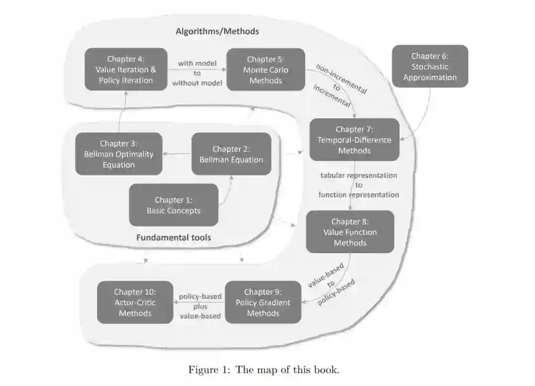 至此,读者可能已经注意到各章内容之间的高度相关性。例如,研究 MC 算法(第 5 章)必须先理解策略迭代算法(第 4 章);学习策略迭代则需先掌握价值迭代(第 4 章);理解价值迭代需建立在贝尔曼最优方程(第 3 章)的基础上;而理解贝尔曼最优方程又需预先学习贝尔曼方程(第 2 章)。因此,强烈建议读者循序渐进地阅读,否则后期章节的内容可能难以理解。 * 第 6 章 旨在填补第 5 章到第 7 章之间的知识断层。第 5 章的算法是非增量式的,而第 7 章的算法是增量式(incremental)的。为此,第 6 章引入了随机逼近(stochastic approximation)理论。随机逼近是一类用于求解求根或优化问题的随机迭代算法。经典的 Robbins-Monro 算法与随机梯度下降(stochastic gradient descent, SGD)均属于随机逼近算法的特例。尽管本章未直接介绍强化学习算法,但它为第 7 章的学习奠定了必要的数学基础。 * 第 7 章 介绍了经典的时序差分(temporal-difference, TD)算法。有了第 6 章的铺垫,读者在接触 TD 算法时将不再感到突兀。从数学角度看,TD 算法可视为求解贝尔曼方程或贝尔曼最优方程的随机逼近过程。与蒙特卡洛学习类似,TD 学习也是无模型的,但其增量形式带来了显著优势。例如,它可以实现在线学习(online learning):每接收到一个经验样本即可更新价值估计。本章介绍了诸如 Sarsa 和 Q-learning 等多种 TD 算法,并引入了**同策略(on-policy)与异策略(off-policy)的重要概念。 * 第 8 章 介绍了价值函数近似(value function approximation)**方法。实际上,本章延续了对 TD 算法的探讨,但采用了不同的状态/动作价值表示方式。在前几章中,价值通过表格(tabular method)表示,虽易于理解,但在处理大规模状态或动作空间时效率低下。为解决此问题,我们引入了价值函数近似法。理解该方法的关键在于掌握其优化公式的三个步骤: