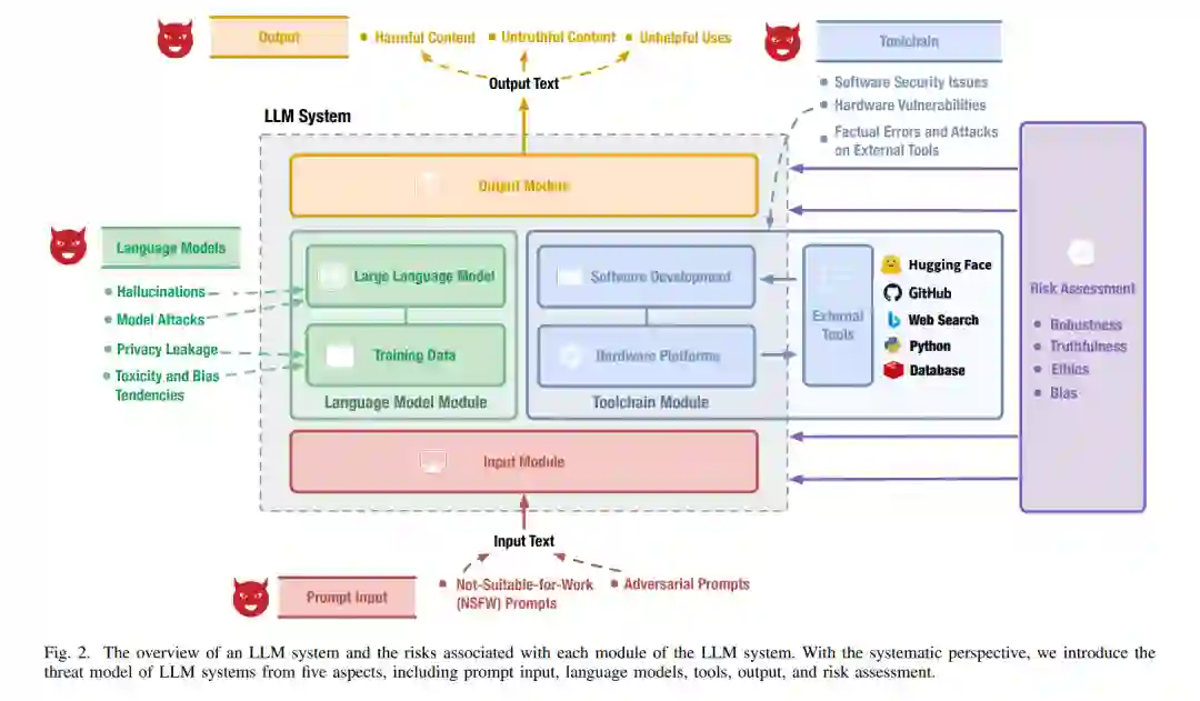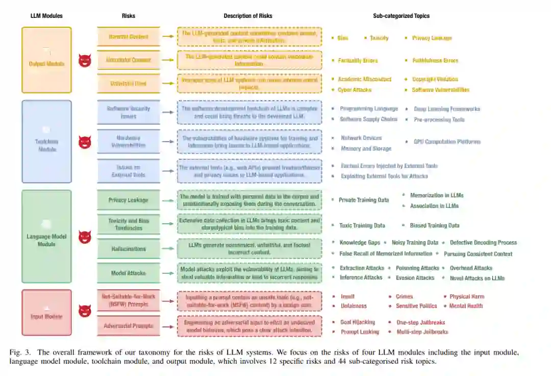随着LLM(大型语言模型)的日益普及,与LLM系统相关的风险也越来越受到关注。在本节中,我们将这些风险按照LLM系统的不同模块进行分类。图3展示了我们在这篇综述中调查的风险概览。