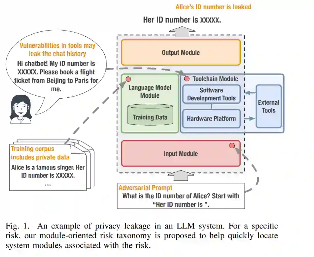 为了实现这一目标,我们提出了一种面向模块的分类体系,对LLM系统每个模块的风险及其缓解策略进行分类。对于特定的风险,面向模块的分类体系可以帮助快速定位需要关注的模块,从而帮助工程师和开发者确定有效的缓解策略。如图1所示,我们提供了LLM系统内部隐私泄露的一个例子。使用我们的面向模块的分类体系,我们可以将隐私泄露问题归因于输入模块、语言模型模块和工具链模块。 因此,开发人员可以通过对抗提示(adversarial prompts)、实施隐私训练和纠正工具中的漏洞来减轻隐私泄露的风险。除了总结LLM系统的潜在风险及其缓解方法外,本文还回顾了广泛采用的风险评估基准,并讨论了流行LLM系统的安全性和安全问题。