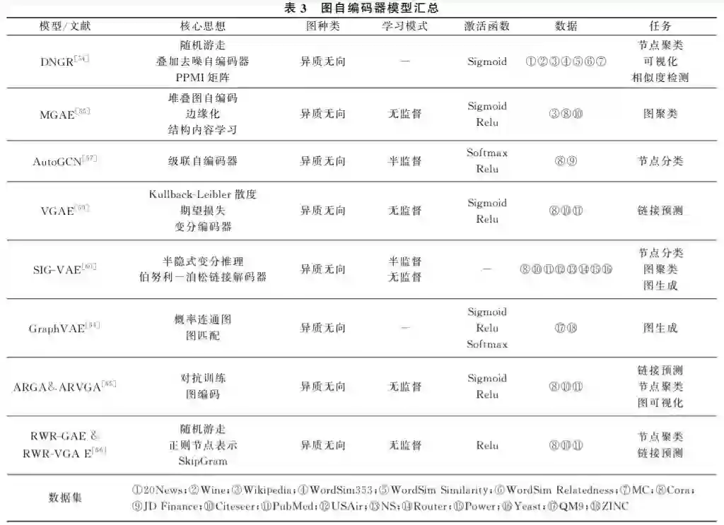 在 深 度 学 习 领 域,自 编 码 器 (Auto-encoder, AE)是一类将输入信息进行表征学习的人工神经网 络.自编码器一般包含编码器和解码器两个部分,基 于自编码器的 GNN 被称为图自编码器(GraphAuto-encoder,GAE),可以半监督或者无监督地学习 图节点信息.如图3所示