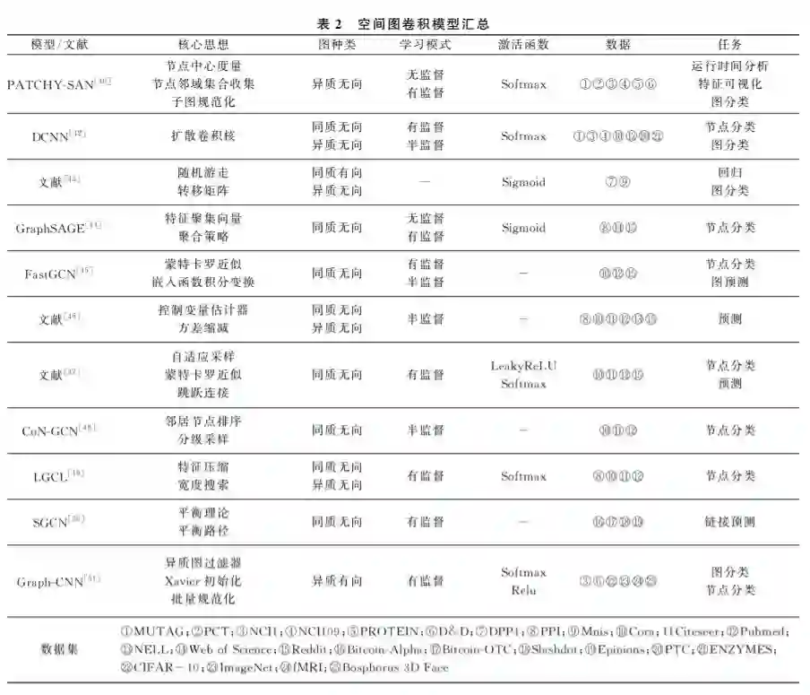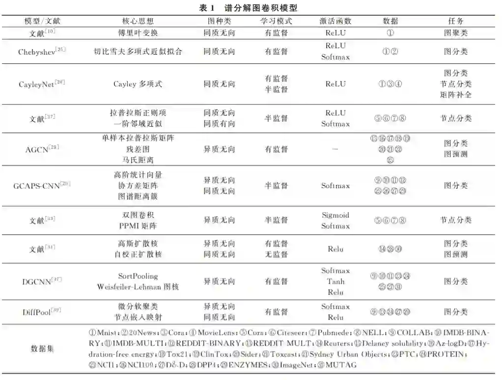 图 卷 积 网 络 (GraphConvolutionalNetwork, GCN)进行卷积操作主要有两种方法:一种是基于 谱分解,即谱分解图卷积.另一种是基于节点空间变 换,即空间图卷积.Bruna等人[10]第一次将卷积神 经网路泛化到图数据上,提出两种并列的图卷积模 型———谱分解图卷积和空间图卷积.Bruna等人对 比分析了一般图结构数据和网格数据共有的特点和 不同之处,综合运用了空间图卷积和谱分解处理图 像聚类问题.下面本文对谱分解图卷积和空间图卷积进行详细的梳理和介绍。