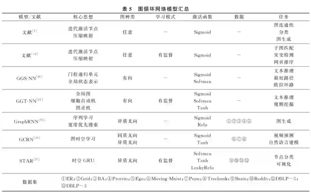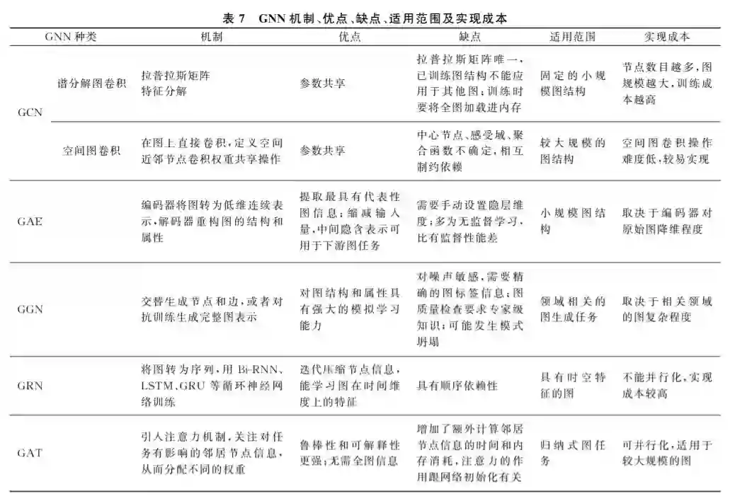 通过前文的归纳和分析, 从总体上看, 图神经网络可以分为五类: 图卷积网络、图自编码器、图生成网络、图循环网络和图注意力网络.每种图神经网络 都有自己对图结构数据处理的一套算法和体系,其 中的原理和适用的范围也有一定差别.当然它们之 间不是相互孤立和排斥的,例如文献[59,65]的图自 编码器中包含图卷积层,文献[91,95]的图循环网络 为了图序列学习更有效,也会加入注意力模块.而图 注意力网络也大多以其他图神经网络框架为基础, 构建合适的节点、边以及图注意力网络层.因此在实 际操作当中,需要根据图的分布和特征信息,以及任 务的实际需求,选择合适的图神经网络,来更加有效 地学习图结构数据. 表7是 GNN 机制、优点、缺点、 适用范围及实现成本汇总表。