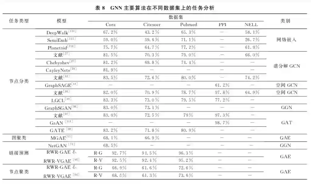 由于现实世界数据的复杂性,抽象出来的图结 构也会有很多的种类和变体.有向无向、异质非异 质、带权不带权等等,大部分的 GNN 仅能处理其中 的某一种类型.而更普遍的情况是各种各样的图混 杂在一起,并且希望 GNN 能满足诸如节点分类、图 分类、可视化、图生成等多种任务需求.在这种复杂 的高强度的任务要求下,单一的神经网络作用过于 有限.因此对于更加复杂的情况,有必要进行多网络 融合.目前比较主流的多网络融合方式是 GCN 与 其他 GNN 算法相结合.例如在节点属性和图拓扑 结构信息的获取上,GCN 明显具有较高的性能和良 好的适应性,在节点分类问题上会表现良好.鉴于其 优点,在 GAE中不乏部分模型使用 GCN 作为编码 器,取得较好的效果.但如果还需要进行链接预测、 节点生成或者图生成,GCN 则有点力不从心了.此 时可以再增设一个 GGN,输入 GCN 处理后的节点 嵌入向量,在 GGN 内生成概率分布,完成生成式任 务.如果图在不断地递归演进,形成了图序列.则可以 利用 GRN来处理,以攘括多个步骤下的图信息.因此 在 GNN框架中构造不同用途的深度神经网络,从不 同的侧面来提取和整合数据的特征是十分有必要的. 此 外 可 以 对 诸 如 深 度 置 信 网 络 (DeepBeliefNetwork)[151]、Transformer [152]等神经网络进行改造,将 其泛化和应用至图结构数据学习上。