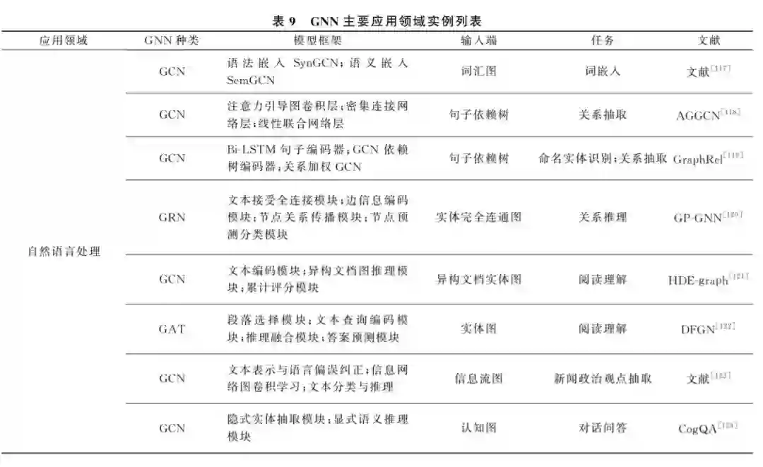 由于 GNN 能较好地学习图结构数据的特征, 因此在许多图相关的领域有着广泛的应用.若按照 应用中图的层次结构划分,则大体可以分为节点、边 和图层面.在节点层面,常见的有节点分类、节点聚 合、节点表示学习.在边层面,则有边分类、边聚类以 及链接预测.在图层面,图分类、图生成、子图划分、 图相似度分析等应用较为广泛.按照图的种类划分, 可以分为引文网络、社交网络、交通网络、图像、化合 物分子结构、蛋白质网络等.按照应用领域划分,可 以分为自然语言处理、图像处理、轨迹预测、物理化 学和 药 物 医 学 等.为 了 方 便 说 明 和 阐 述, 本 文 从 GNN 的主要应用领域这一角度出发,对近年来出现 的 GNN 应用实例进行分类归纳。