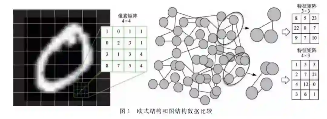 但是随着研究的深入,研究人员发现深度学习 并不能适应和解决所有的情况和问题.在过去十多 年的发展中,深度学习取得的成就主要限定在了计 算机视觉、自然语言处理和音频分析领域上.这些领 域上的数据和信息有着比较显著的特点.文本、图 像、音频、视频的数据格式在形式上有着统一而规整 的尺寸和维度,它们也被称作欧式结构(Euclidean Structure)或者网格结构(GridStructure)数据.除 此之外,现实生活中存在大量的非欧式结构的图数 据,例如互联网、知识图谱、社交网络、蛋白质、化合 物分子等.尽管深度学习在欧式结构数据上取得巨 大的成功,但在图结构数据上,基于神经网络的深度 学习表现得并不好.在图结构数据中,节点与节点之 间的边连接可能是均匀分布的,也可能是不均匀的. 节点与节点之间没有严格意义上的先后顺序.对于神经网络的输入端而言,这些数据没有固定的输入 尺寸.在数学表达上,这些数据与欧式结构数据相 比,每一个区块的特征矩阵维度都不是统一的,如图 1所示.由于无法使用统一规整的算子对数据编排, 导致 CNN 等神经网络不能再直接对其进行诸如卷 积和池化等操作,也就不再有局部连接、权值共享、 特征抽象等性质[8].如何将 CNN 等深度学习算法 用于分析图结构数据上成为一个有挑战性和前沿性 的课题.近年来 Gori等人[9]用 RNN 来压缩节点信 息和学习图节点标签,首次提出图神经网络(Graph NeuralNetwork,GNN)这一概念.之后文献[10]提出 图 卷 积 网 络 (Graph Convolutional Network, GCN),正式将 CNN 用于对图结构数据建模.GCN 通过整合中心节点和邻居节点的特征和标签信息, 给出图中每个节点的规整表达形式,并将其输入到 CNN 中.这样一来 GCN 就能利用多尺度的信息, 组合成更高层次的表达.其有效地利用了图结构信 息和属性信息,为深度学习中其他神经网络迁移至 图上提供了标准的范式.在新的研究思路的基础上, 各种 GNN 架构相继被构造出来,在多个领域的图 结构数据中发挥了独特的作用,并促进了图相关的人工智能推理任务的发展。