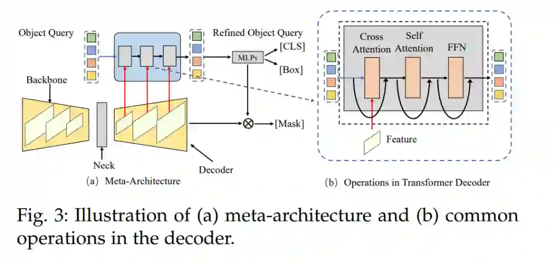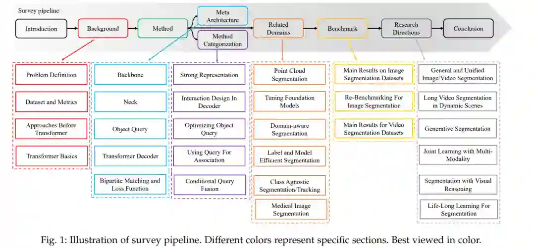 最近,随着自然语言处理(NLP)的成功,变换器(Transformer)[13]被引入作为循环神经网络(RNNs)[14]的替代品。Transformer包含一个新颖的自注意力设计,并可以并行处理各种标记。然后,基于Transformer设计,BERT [15]和GPT-3 [16]将模型参数扩展并使用大量未标记的文本信息进行预训练。它们在许多NLP任务上取得了强大的性能,加速了变换器进入视觉领域的发展。最近,研究人员将变换器应用于计算机视觉(CV)任务。早期方法[17]、[18]将自注意力层与CNN相结合。同时,一些工作[19]、[20]使用纯自注意力层替换卷积层。之后,两种显著的方法推动了CV任务的发展。一种是视觉Transformer(ViT)[21],它是一种纯粹的Transformer,直接接收图像块序列来对整个图像进行分类。它在多个图像识别数据集上实现了最先进的性能。另一种是检测Transformer(DETR)[22],它引入了对象查询的概念。每个对象查询表示一个实例。对象查询取代了之前检测框架中复杂的锚点设计,简化了检测和分割的流程。然后,随后的工作在各种视觉任务上采用改进的设计,包括表示学习[23]、[24],对象检测[25],分割[26],低级图像处理[27],视频理解[28],3D场景理解[29]以及图像/视频生成[30]。在视觉分割方面,最近的最先进方法都是基于变换器架构的。与基于CNN的方法相比,大多数基于变换器的方法具有更简单的流程但更强大的性能。由于基于变换器的视觉模型的迅速兴起,有关视觉变换器的调查有很多[31]、[32]、[33]。然而,其中大多数主要关注通用变换器设计及其在几个特定视觉任务上的应用[34]、[35]、[36]。同时,还有关于基于深度学习的分割的先前调查[37]、[38]、[39]。然而,在我们所知范围内,尚无专门针对使用视觉变换器进行视觉分割或基于查询的对象检测的调查。我们相信,总结这些工作并持续关注这个不断发展的领域将对社区有益。贡献。在本综述中,我们系统地介绍了基于变换器的视觉分割方法的最近进展。我们从定义任务、数据集和基于CNN的方法开始,然后转向基于Transformer的方法,涵盖现有方法和未来工作方向。我们的调查从方法细节的更技术性的角度对现有的代表性工作进行了归类。特别是,对于主要的综述部分,我们首先在第3.1节中将现有方法的核心框架总结为一个元架构,这是DETR的扩展。通过改变元架构的组件,我们将现有方法分为六类,包括表示学习、解码器中的交互设计、优化对象查询、使用查询进行关联以及条件查询生成。此外,我们还研究了密切相关的具体设置,包括点云分割、基础模型调优、领域感知分割、数据/模型高效分割、类别不可知分割和跟踪以及医疗分割。还评估了在顶级会议和期刊上发表的有影响力的作品在几个广泛使用的细分基准上的表现。此外,还提供了以前基于CNN的模型和其他领域的相关文献的概述,如目标检测,目标跟踪,以及背景部分中的参考分割。范围。本综述将涵盖几个主流的分割任务,包括语义分割、实例分割、全景分割及其变体,如视频和点云分割。此外,我们在第4节中介绍了相关的下游设置。本文专注于基于transformer的方法,只回顾了一些与cnn密切相关的方法,以供参考。虽然有很多预印本或已出版的作品,但我们只收录最具代表性的作品。组织。调研的其余部分组织如下。总的来说,图1显示了我们调查的流程。在第2节中,首先介绍了问题定义、数据集和基于CNN的方法的背景知识。然后,回顾了第3节和第4节中关于基于transformer的分割方法的代表性论文。第5节对实验结果进行了比较。最后,我们在第六节提出了未来的研究方向,并在第七节总结了本文的研究。2. 方法综述****在本节中,基于类似DETR的元架构,回顾了基于transformer的分割的关键技术。如图3所示,元架构包含一个特征提取器、对象查询和transformer解码器。然后,以元体系结构为主线,综述了第3.2.1、3.2.2和3.2.3节中对元体系结构各个组成部分的修改或改进;最后,在3.2.4节和3.2.5节给出了基于这种元体系结构的几个具体应用。