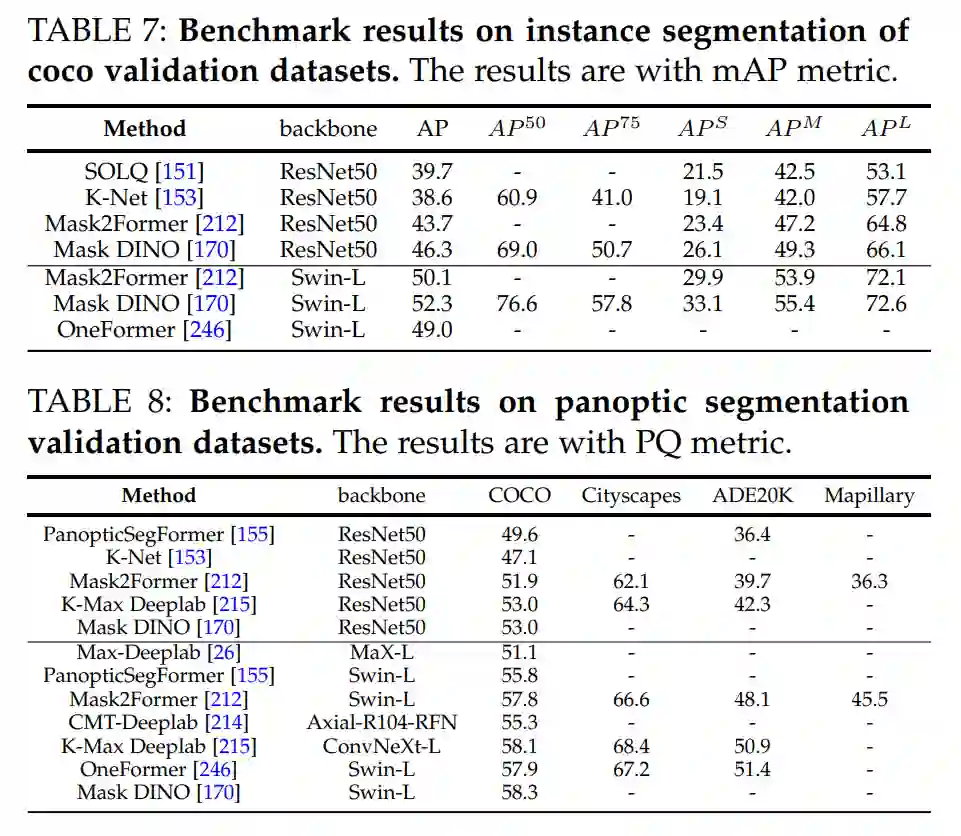 生成式分割。随着更强大的生成模型的兴起,最近的工作[346],[347]受扩散模型中更强的transformer解码器和高分辨率表示的启发,通过生成建模解决了图像分割问题[348]。采用生成式设计,避免了transformer解码器和对象查询设计,使整个框架更加简单。然而,这些生成模型通常会引入一个复杂训练管道。进一步的研究需要更简单的训练管道。