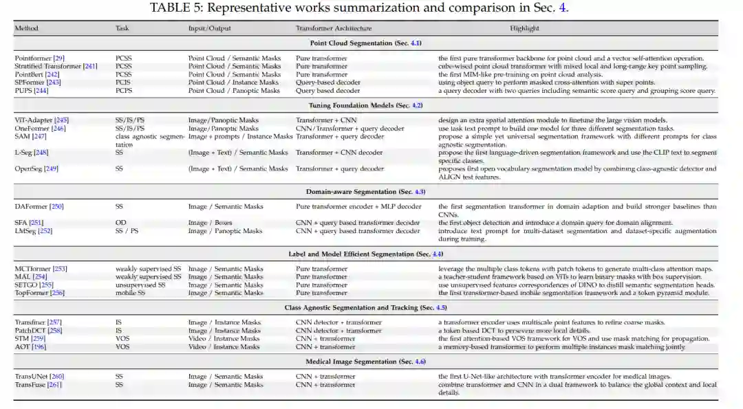 在本节中,我们会回顾几个采用视觉transformer进行分割任务的相关领域。这些领域包括点云分割、域感知分割、标签和模型高效分割、类无关分割、跟踪和医疗分割。我们在表5中列出了一些有代表性的作品进行比较。