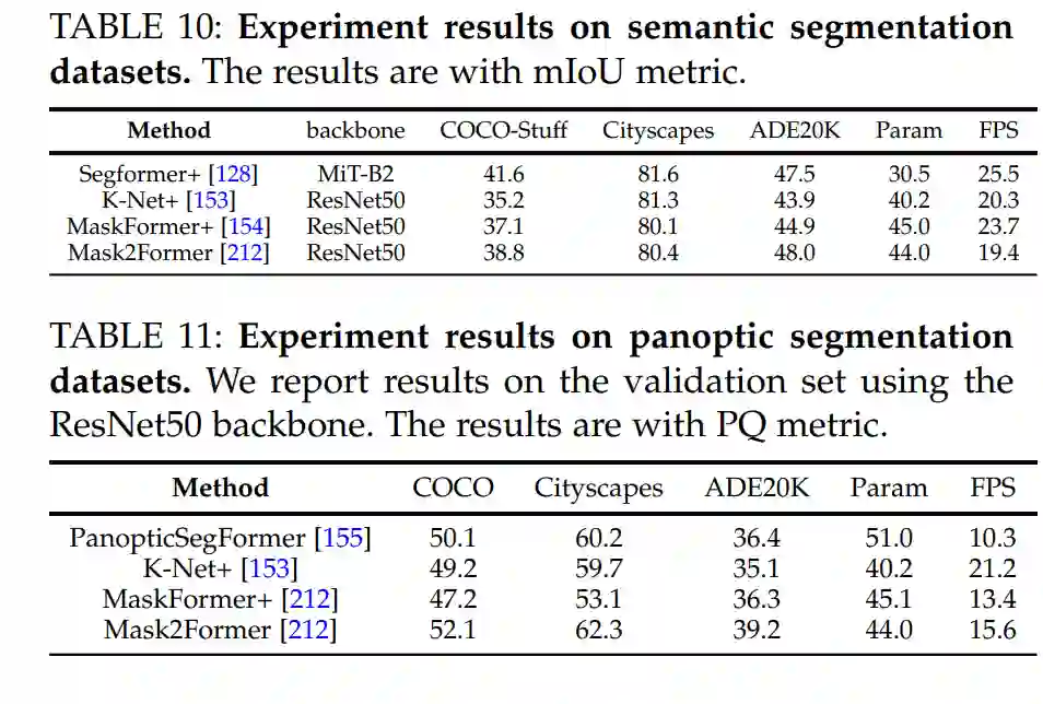 在本节中,我们报告了最近基于transformer的视觉分割,并列出了之前讨论的算法的性能。对于每个审阅的领域,第5.1节和第5.3节选择了使用最广泛的数据集作为性能基准。我们使用相同的数据增强和特征提取器进一步对第5.2节中的几个代表性作品进行了基准测试。请注意,我们仅列出已发表的工作供参考。为简单起见,我们排除了一些关于表示学习的工作,只介绍了特定的分割方法。关于全面的方法比较,请参阅补充资料,提供了更详细的分析。