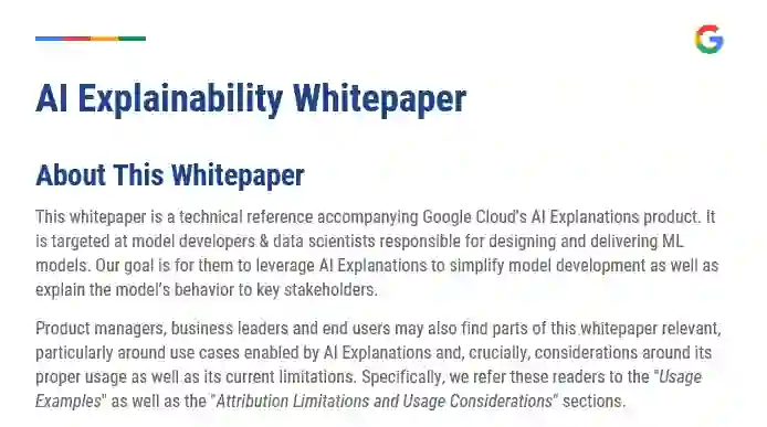 简介: 本白皮书是Google Cloud AI解释产品随附的技术参考。 它面向负责设计和交付ML模型的模型开发人员和数据科学家。 我们的目标是让他们利用AI解释来简化模型开发并向主要利益相关者解释模型的行为。 产品经理,业务负责人和最终用户也可能会发现本白皮书的相关部分,特别是围绕AI解释的用例,以及至关重要的是围绕其正确用法及其当前限制的考虑。 具体来说,我们向这些读者介绍"用法示例"以及"归因限制和使用注意事项"部分。