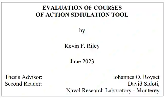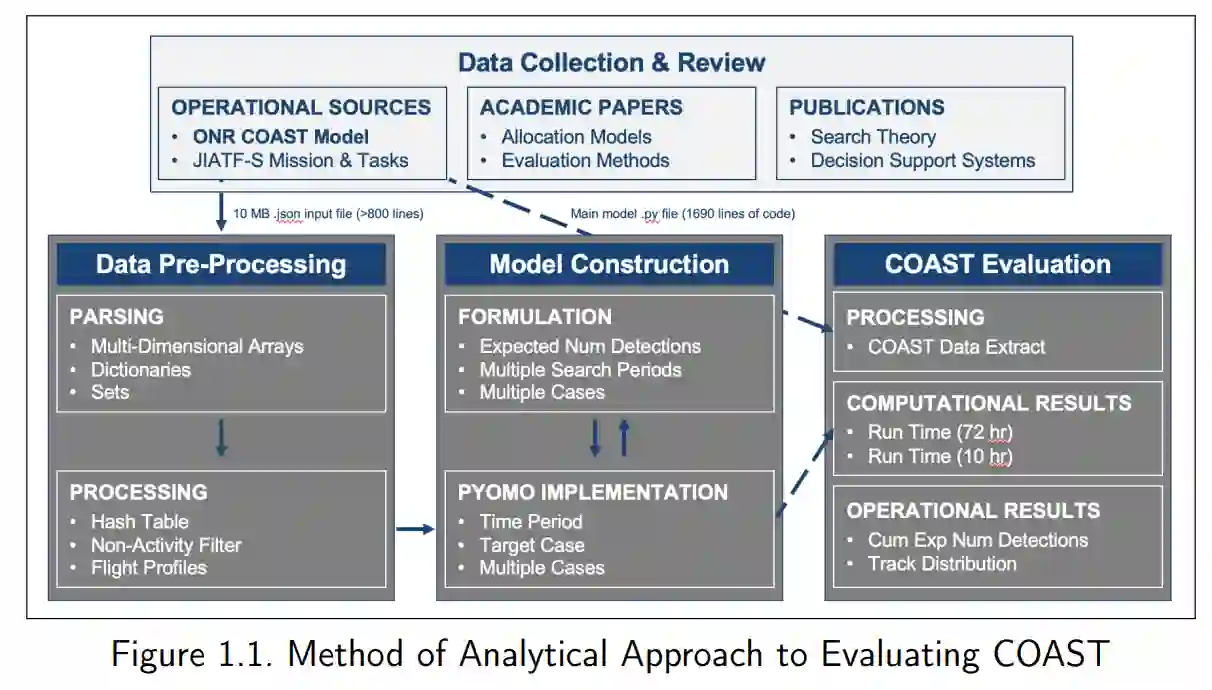 本论文是与美国海军研究实验室(U.S. Naval Research Laboratory)密切合作完成的,该实验室是美国海军的企业研究实验室,也是海军研究办公室下属的主要研发部门。NRL 对 SAP 的回应是行动方案模拟工具 (COAST),这是一个建模框架,可解决众多规划因素和决策支持系统,从而提高规划人员分配资源的能力。COAST 使用启发式方法来决定将哪些单元分配给搜索飞机。我们提供了一个用于评估 COAST 建议质量的验证工具。