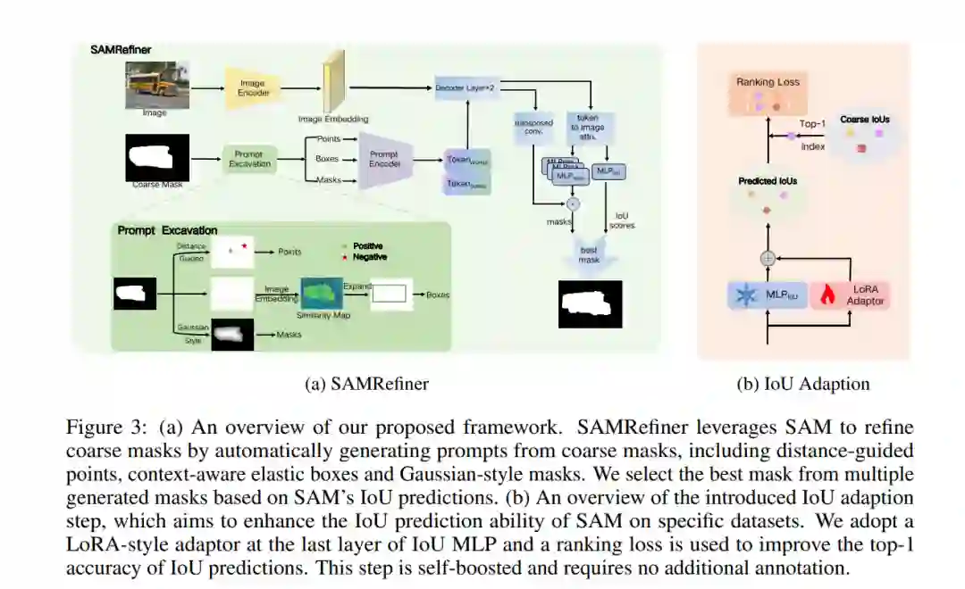 在本文中,我们探讨了一种主要方法,以提升广泛存在的粗略掩码的质量,使其能够作为可靠的训练数据,供分割模型使用,从而减少标注成本。与先前专门针对特定模型或任务的精细化技术不同,我们提出了SAMRefiner,这是一种通用且高效的方法,通过将SAM适配到掩码精细化任务中。我们模型的核心技术是噪声容忍的提示方案。具体而言,我们引入了一种多提示挖掘策略,从初始粗略掩码中挖掘出多样的输入提示,以供SAM使用(即,基于距离的点、上下文感知的弹性边界框和高斯风格的掩码)。这些提示可以相互协作,以减轻粗略掩码缺陷的影响。特别是考虑到SAM在处理语义分割中的多物体情形时的困难,我们引入了一个“拆分后合并”(STM)流程。此外,我们通过引入额外的IoU适配步骤,将我们的方法扩展为SAMRefiner++,进一步提升了通用SAMRefiner在目标数据集上的表现。这个步骤是自增强的,不需要额外的标注。所提出的框架具有高度的通用性,能够灵活地与现有的分割方法协作。我们在各种基准测试下评估了我们的掩码框架,在不同设置下展示了更好的准确性和效率。SAMRefiner具有显著的潜力,能够加速精细化工具的发展。我们的代码可在SAMRefiner上获取。