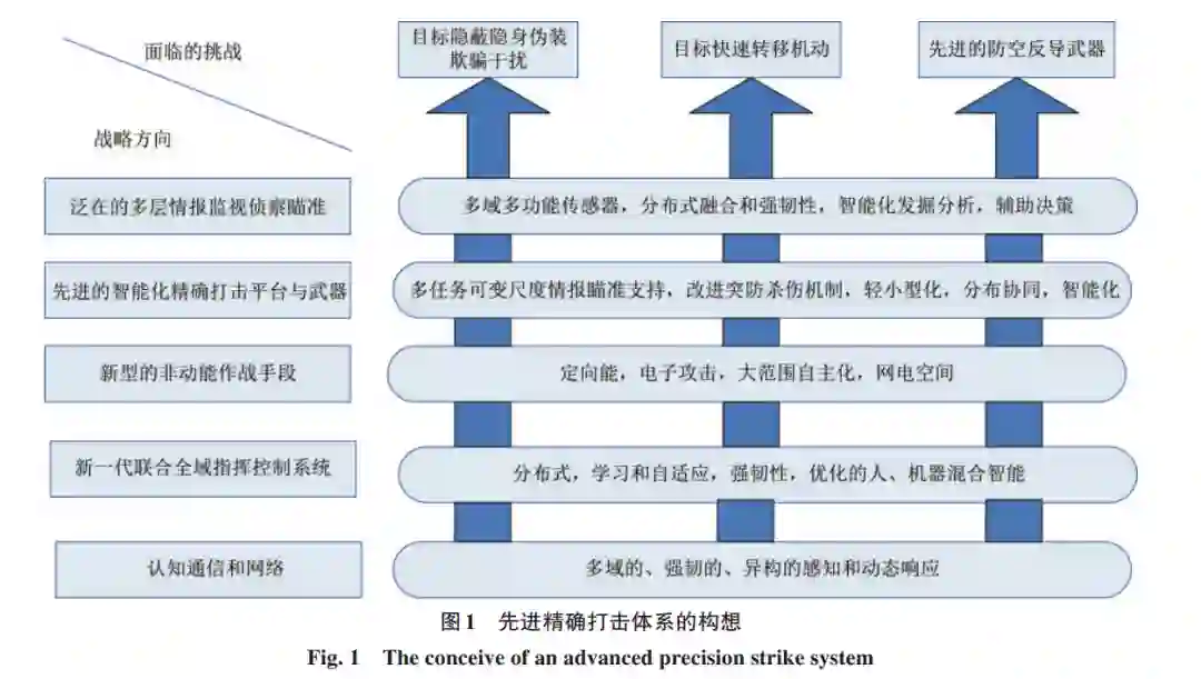 近年来,为满足与“近对等”的对手作战以及在复 杂战场环境中有效打击高机动、时敏、隐身、隐蔽、伪 装目标及集群目标的迫切需求,美国等国正在精确打 击作战概念、体系和武器装备能力建设方面进行转 型,其中包括:发展和实施分布式协同作战、联合全域 作战等新作战概念,构建下一代战场网络,实现从杀 伤链到杀伤网转型;发展先进作战平台、精确打击信 息支持系统、电子战装备及精确制导武器装备与技 术,构建先进精确打击体系,优化体系中各类武器的 配置,进而改进整个杀伤链,以期在未来更加复杂的 作战环境中,确保比对手更快地闭合杀伤链,有效突 防并高效、精准地打击各类目标[1-10] 。 基于先进的情报监视侦察系统、指挥控制系统、 电磁域作战系统和精确打击武器,建立信息、决策与 行动优势,实现高效跨域协同精确打击,成为精确打 击体系的发展重点。人工智能等前沿技术对实现信息优势和决策优势具有重要作用。分析表明,将智能 化技术用于精确打击体系杀伤链中,可望显著提高态 势感知、目标识别、协同打击等能力,实现更快、更及 时的决策,在复杂多变的战场环境和激烈的攻防对抗 博弈条件下,高效、精确地打击各类目标[11-27] 。经过 几十年的发展,人工智能/机器学习得到爆发式的发 展,其在传统的挑战性领域(如机器视觉、自然语言处 理等)的成功已经成为不争的事实,在由物理学主导 的工程学科领域(如材料科学、机器人学和控制及 宇 航 工 程),人 工 智 能 和 机 器 学 习 也 得 到 成 功 应用[11,18] 。 基于在军用系统中采用人工智能/机器学习可望 带来显著收益的预期,以及近十几年来人工智能技术 的迅速发展及其在商用、工业和科学等领域的成功应 用经验,美国2018年国防战略将人工智能和机器学习 的军事应用列为美国军队现代化战略的关键单元,将 人工智能/机器学习当作下一代战场网络、人-机协同 作战、人员辅助作战和网络化自主武器等的赋能技 术。近年来美国军方、相关国家研究机构和几大军工 集团显著加大了将智能化技术用于精确打击杀伤链 的探索和研发、试验力度[11-27] 。 本文分析了先进精确打击体系对智能化技术的 需求,讨论了智能化技术对提高精确打击体系杀伤链 各环节能力的作用,重点介绍了精确打击体系信息支 持系统智能化与交战环节智能化的整体发展情况,并 简述了相关的关键技术。