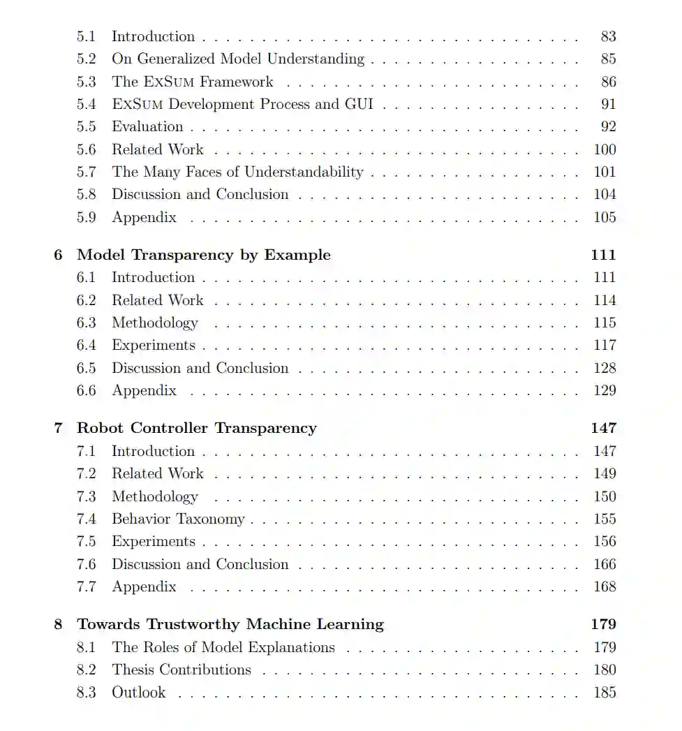 接下来,我们探讨了解释哪些实例的问题,并将透明度示例观点作为回答这个问题的方法。我们展示了这种方法在揭示图像分类器和机器人控制器的隐藏属性方面的优势。最后,本论文确定了未来研究的方向,并倡导将模型可解释性和透明度更紧密地融入到可信赖机器学习研究的生态系统中,该生态系统还包括公平性、鲁棒性和隐私等方面的努力。