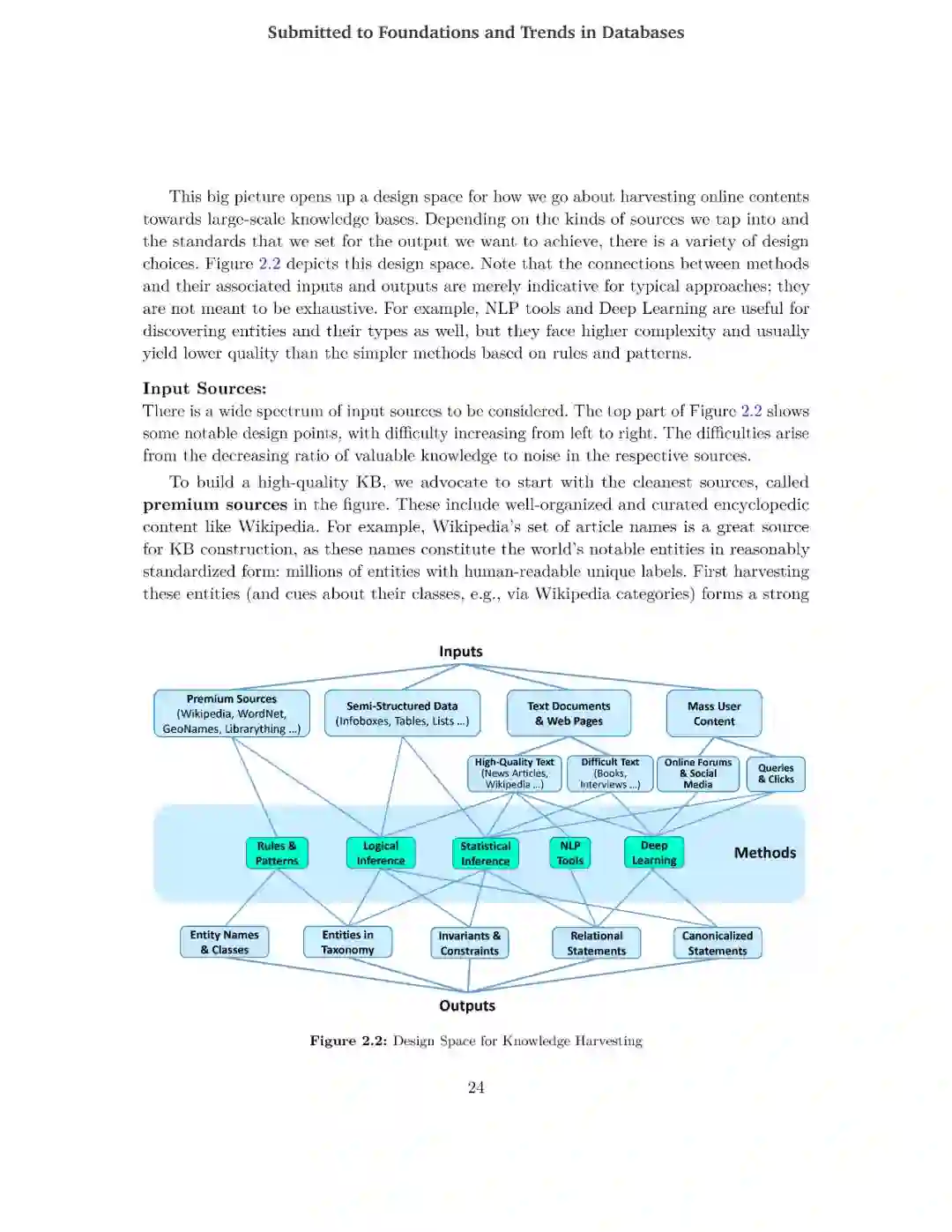 本文介绍了从Web和文本源自动构建和管理大型知识库的方法。我们希望它将对博士生和对广泛的主题感兴趣的教师有用——从机器知识和数据质量到机器学习和数据科学,以及web内容挖掘和自然语言理解的应用。此外,本文还旨在为从事web、社会媒体或企业内容的语义技术的行业研究人员和实践者提供帮助,包括从文本或半结构化数据构建意义的各种应用程序。不需要有自然语言处理或统计学习的先验知识;我们将根据需要介绍相关的方法(或至少给出文献的具体指示)。