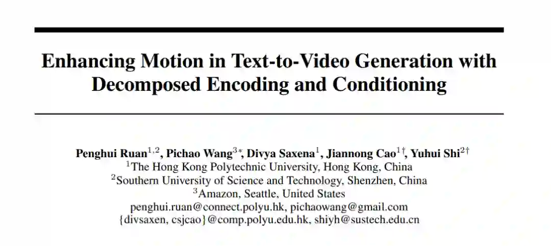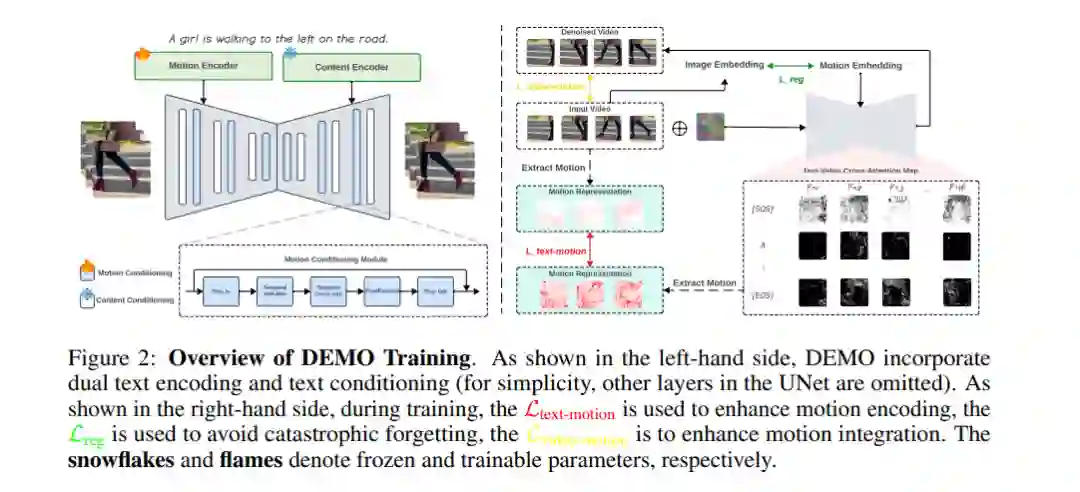 尽管文本到视频(T2V)生成技术已经取得了进展,制作具有真实运动的视频仍然具有挑战性。当前模型通常产生静态或动态变化极少的输出,未能捕捉文本中描述的复杂运动。这个问题源于文本编码中的内部偏差,这些偏差忽视了运动,并且T2V生成模型的条件机制不足。为了解决这个问题,我们提出了一种新颖的框架,称为分解运动(DEMO),该框架通过将文本编码和条件控制分解为内容和运动组件来增强T2V生成中的运动合成。我们的方法包括一个用于静态元素的内容编码器和一个用于时间动态的运动编码器,以及单独的内容和运动条件控制机制。关键是,我们引入了文本-运动和视频-运动的监督,以提高模型对运动的理解和生成能力。在MSR-VTT、UCF-101、WebVid-10M、EvalCrafter和VBench等基准测试中的评估表明,DEMO在生成具有增强运动动态的视频方面表现优越,同时保持高视觉质量。我们的方法通过直接从文本描述中整合全面的运动理解,显著推动了T2V生成的进展。项目页面:https://PR-Ryan.github.io/DEMO-project/