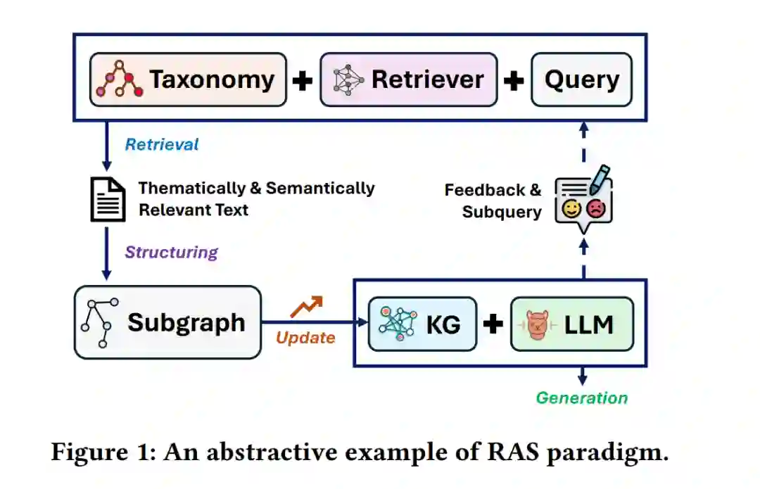 检索与结构化增强生成(Retrieval And Structuring, RAS)作为一种更强大的范式应运而生,它通过将动态信息检索与结构化知识表示相结合,有效克服了上述局限。RAG 为 LLMs 与外部信息建立连接奠定了基础,而 RAS 在此之上进一步扩展其能力:引入知识结构化技术,将非结构化文本转化为有组织的表示形式,如分类体系、层次结构和知识图谱 [46, 224, 299]。这些结构化表示不仅有助于组织检索到的信息,还能引导检索过程,并为验证 LLM 输出提供框架。