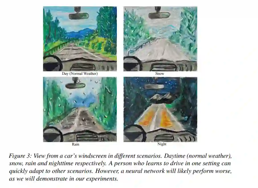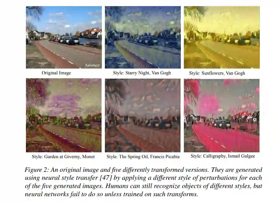 图2中的另一个例子显示了Alsmeerderdijk:原始图像及其在不同绘画风格下的人工变换版本。在原始图像和变换后的图像中,人们可以很容易地识别出道路、运河、停放的汽车、船只、树木、云和房屋。在存在干扰的情况下,人类很容易识别物体。然而,对于神经网络来说,要识别扰动图像中的物体是具有挑战性的,除非网络经过专门的此类变换训练。类似地,专门在晴天收集的数据上训练的自动驾驶汽车网络将在雪天或晚上失败,参见图3。因此,为了使网络智能化,最重要的是对未见过的扰动进行鲁棒性控制。本文不只关注可见的扰动、特定的鲁棒性,而是旨在增强总体的鲁棒性,以及对网络训练过程中未见过的扰动的鲁棒性。