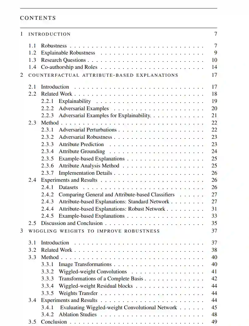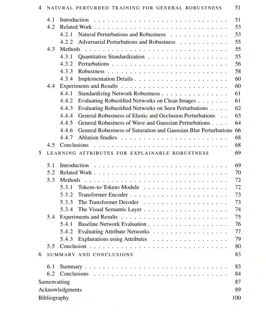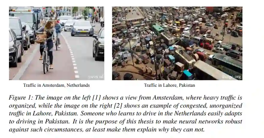 **本文探索了用于视觉分类的神经网络的可解释的鲁棒性。本文研究了使神经网络可在现实世界应用中部署的一个基本问题:“如何使神经网络具有可解释的鲁棒性?”我们首先让神经网络变得可解释。**它从使黑盒神经网络通过利用属性(即物体的视觉区分属性)和扰动来证明其推理,以提供反事实解释开始。接下来的两章侧重于增强神经网络对自然和对抗性扰动的鲁棒性。通过在网络架构中整合扰动来做到这一点,并为修改网络提供了背后的理论依据,通过用类似变换的图像训练标准网络来增强其鲁棒性。最后一章利用属性来提高对扰动的鲁棒性,并作为副产品提供解释。在巴基斯坦,这是右手驾驶,而在荷兰,这是左手驾驶。更重要的是,交通状况和天气状况有很大的不同。在巴基斯坦,司机遇到拥挤的交通,包括行人、汽车、公共汽车、摩托车、人力车、马车和卡车。另一方面,尽管司机必须小心自行车和汽车在同一条路上行驶,但荷兰的交通是有组织的,规则是严格遵守的,如图1所示。此外,巴基斯坦中部是中等到温暖的天气,而在荷兰,人们需要在冬天的雨、风和雪中开车。尽管这些视觉环境不同,在荷兰学习驾驶的人可以很快适应在巴基斯坦驾驶。当涉及到对未见过的视觉环境的泛化能力时,人类具有非凡的能力。他们很容易将他们从以前的经验中学到的东西应用到新的情况中。尽管神经网络在理想情况下显示出人类水平的感知能力[3,14,35,81,89,140],但在它们在学习阶段没有遇到的情况下,它们没有显示出这种能力。目前,它们需要大量的数据来学习所有这些不同的场景,否则就会失败。在2018年的一个这样的例子中,一辆自动驾驶汽车在训练网络时将人误认为物体[10],从而导致了事故,而从未考虑过横穿马路。因此,在将神经网络部署到实际应用中之前,增强其鲁棒性是很重要的。