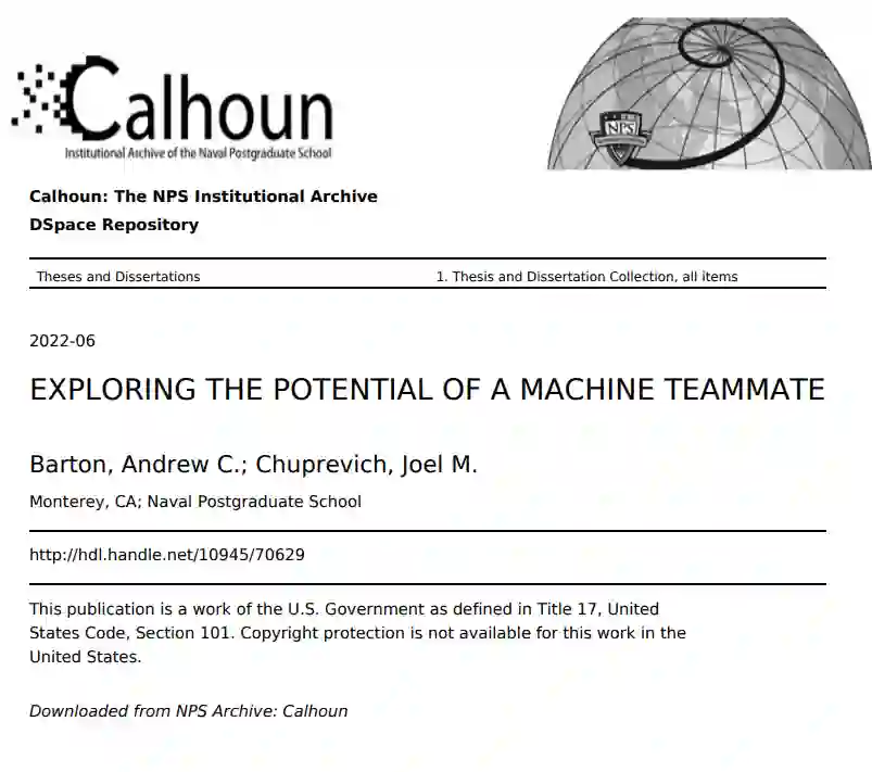 本研究目的是探索人机团队中的沟通、协调和互动动态,并阐述它们对团队敏捷性和绩效的潜在影响。随着人机团队结构在DON中变得越来越普遍,这种探索对于发展对团队动态的理解是必要的。这项研究将产生人机团队的概念模型,可以为未来系统的设计提供参考。这项研究的结果可以帮助美海军军部更好地理解将狭义的人工智能能力整合到团队构建中的影响。这种知识将最终使美国防部能够应用研究结果来提高人机团队的敏捷性。