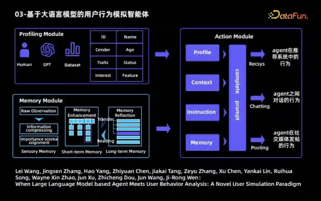 下面会举几个 Agent 的实际案例。首先是基于大语言模型的用户行为模拟智能体。该智能体也是大语言模型智能体与用户行为分析相结合的早期工作。该工作中,每个 Agent 分为三个模块: 1. 画像模块对不同的 Agent 指定不同的属性,比如 ID、姓名、职业、年龄、兴趣以及特征等。 2. 记忆模块记忆模块包括三个子模块(1)感受记忆(2)短期记忆