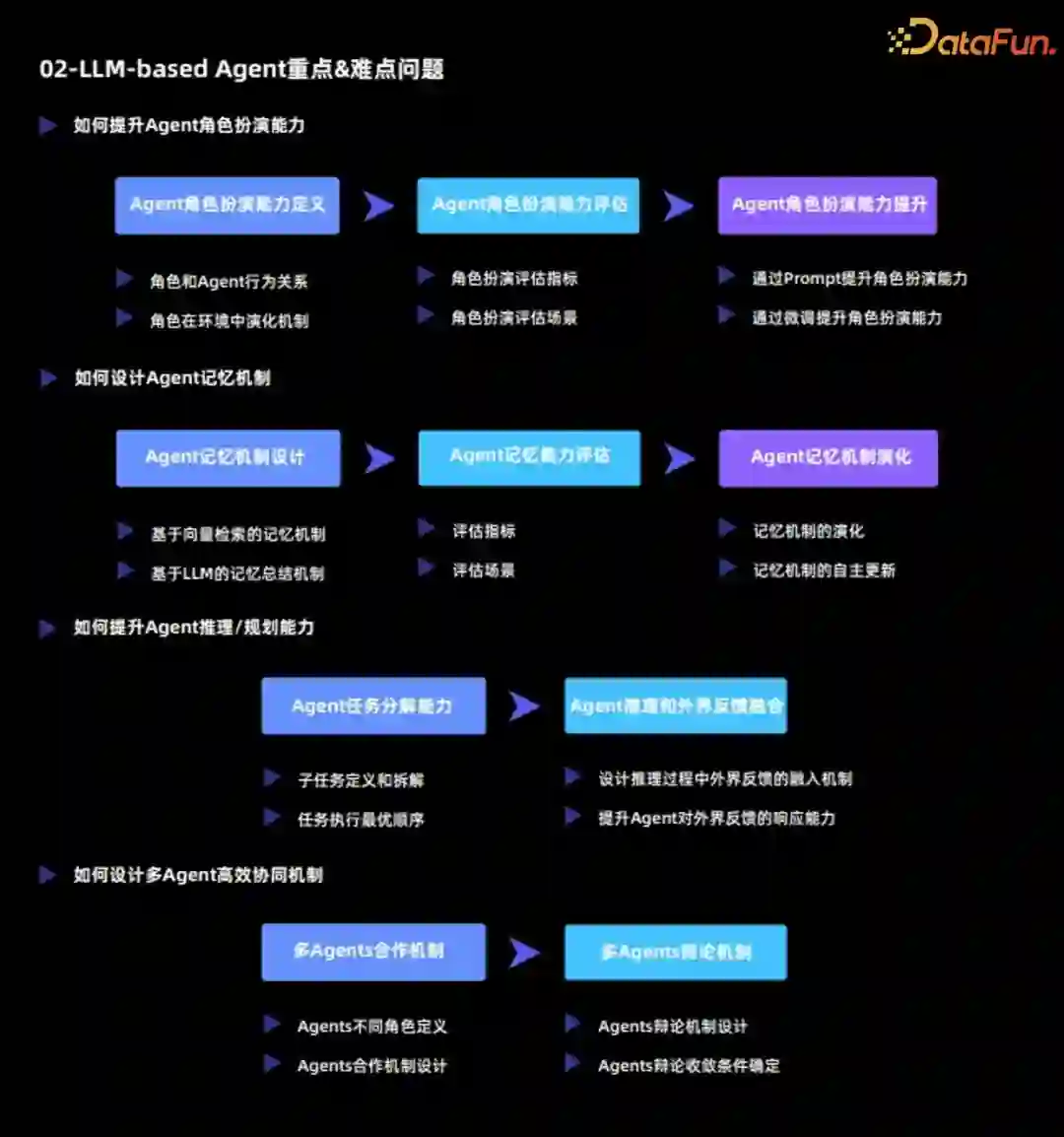 当前大语言模型 Agent 的重点和难点问题主要包括: 1. 如何提升 Agent 的角色扮演能力Agent 最重要的功能是通过扮演某种角色,来完成特定的任务,或者完成各种各样的模拟,因此 Agent 的角色扮演能力至关重要。(1)Agent 角色扮演能力定义Agent 角色扮演能力分为两个维度: