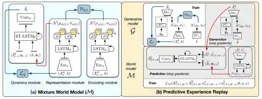 针对以上问题,研究团队开创性地提出了一种可持续时空预测学习框架CPL(Continual Predictive Learning),整体结构如图2所示。在网络结构设计上,针对性地设计了混合世界模型(Mixture World Model),通过引入类别标签分离不同任务对应的时空动态信息。在遗忘数据增广上,提出了基于预测的经验回放(Predictive Experience Replay)策略,通过结合单帧图像生成和世界模型的复用,在内存受限的条件下实现了已有任务数据的生成,打破了数据限制。最后在模型测试流程中,引入了自适应的无参数任务推断机制(Non-Parametric Task Inference),进一步缓解预测阶段的标签遗忘问题。