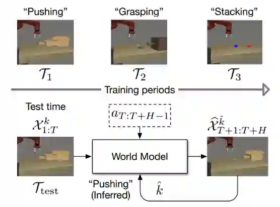 然而,在实际场景中,如图1所示,模型所面临的环境或任务可能是动态变化的,即待学习的预测任务可能以序列化的非平稳的形式出现,比如机械臂需要首先完成推动的动作,再分别学习抓取和堆叠的动作。模型需要序列化地学习一连串不同的任务,而在学习当前任务时,我们无法获得或只能少量获得之前任务的训练数据。在这种持续学习(Continual Learning)的设定下,多数现有的预测学习方法会遭遇严重的灾难性遗忘(Catastrophic Forgetting)问题,即模型在学习任务序列的过程中,会逐渐遗忘掉之前已学习任务的知识,造成在之前任务上测试性能的降低,并且研究人员发现直接将已有作用在图像领域的持续学习方法应用到时空预测上并不能取得很好的效果。